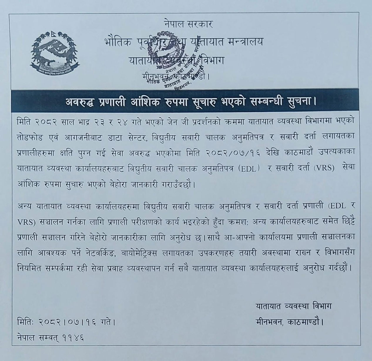 गत २३ र २४ भदौको जेनजी आन्दोलनका क्रममा यातायात व्यवस्था विभागमा आगजनी तथा तोडफोड हुँदा इलेक्ट्रोनिक उपकरण, छपाइ मेसिन तथा सर्भरमा क्षति पुग्दा लाइसेन्स तथा विद्युतीय सवारीसाधन दर्तासम्बन्धी सेवा बन्द भएको थियो।