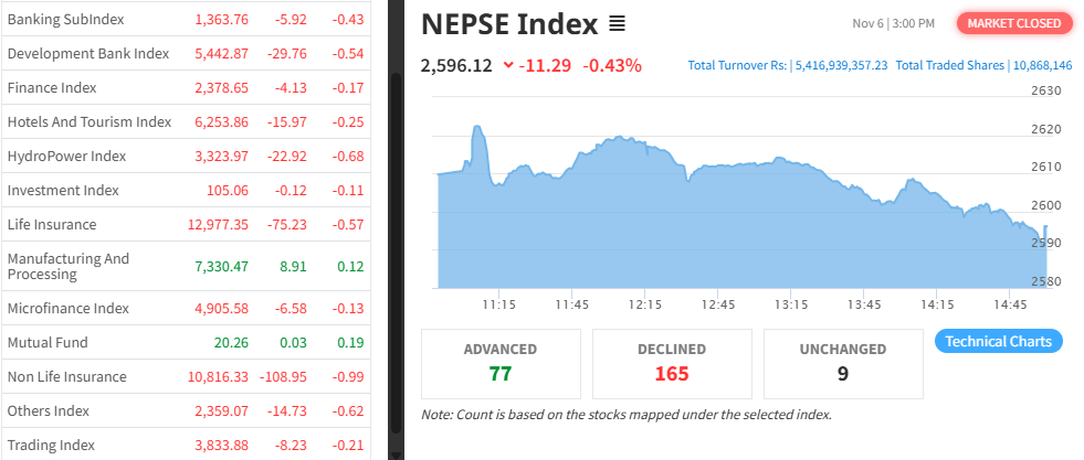 काठमाडौँ। साताको अन्तिम कारोबार दिन आज (बिहीबार) नेप्से ११.२९ अंकले घटेको छ। योसँगै नेप्से २‚५९६.१२ को विन्दुमा रोकिएको छ।
