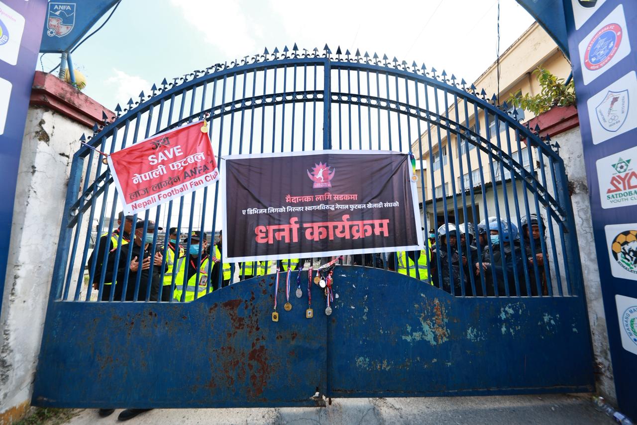 काठमाडौँ। अखिल नेपाल फुटबल संघ (एन्फा) र ए डिभिजन क्लबहरूबीच यो वर्ष ए डिभिजन लिग नगरी राष्ट्रिय लिग मात्र गर्ने सहमति भएपछि खेलाडीहरू विरोधमा उत्रिएका छन्। नेपाल फुटबल खेलाडी संघको आह्वानमा बिहीबार खेलाडीहरूले सातदोबाटोस्थित एन्फा मुख्यालयबाहिर धर्ना दिए।