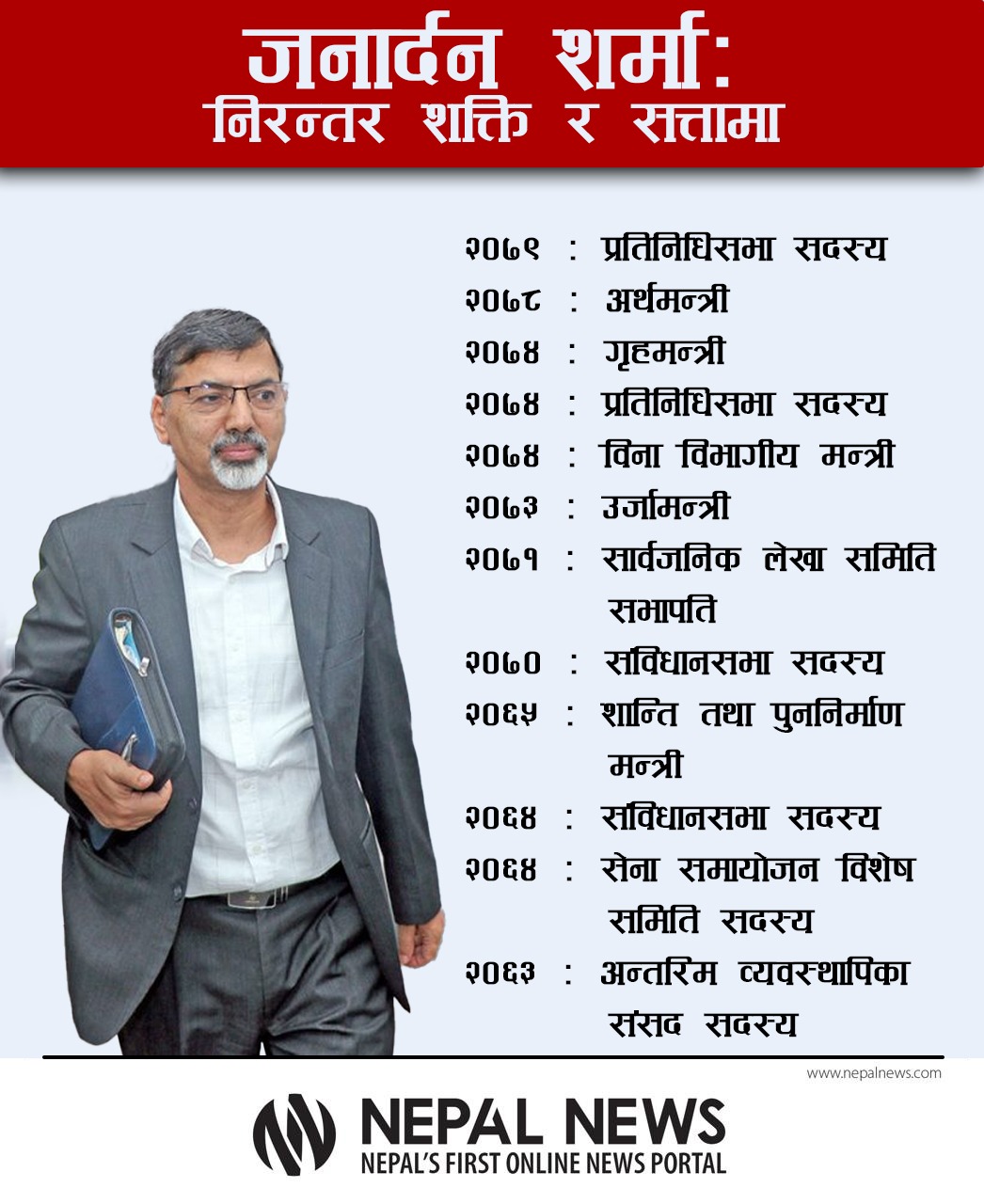 २०७० सालमा स्थायी समिति सदस्य भएका जनार्दन २०७८ सालमा माओवादीको संगठन विभाग प्रमुख भए। १० वामबीच १९ कात्तिकमा भएको पार्टी एकताअघि माओवादी अध्यक्ष दाहालले भदौ २०७९ मा जनार्दनलाई उपमहासचिवको जिम्मेवारी ‘अफर’ गरेका थिए। तर, उनले अस्वीकार गरे। त्यतिबेला उनी पार्टी महासचिवका दाबेदार थिए। दाहालले एकाएक देव गुरुङलाई महासचिव बनाएपछि भने जनार्दन बिच्किएका थिए। माओवादी सरकारमा हँदा पटक पटक लाभको पद पाउनेमा पर्छन् जनार्दन शर्मा। माओवादीका तर्फबाट उनी गृह, अर्थ, ऊर्जा, शान्ति तथा पुनर्निर्माणमन्त्री भइसकेका छन्। उनी एकपटक विना विभागीय मन्त्रीसमेत भएका थिए।