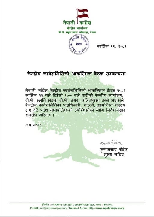 काठमाडौँ। नेपाली काँग्रेसले केन्द्रीय कार्यसमितिको आकस्मिक बैठक बोलाएको छ।