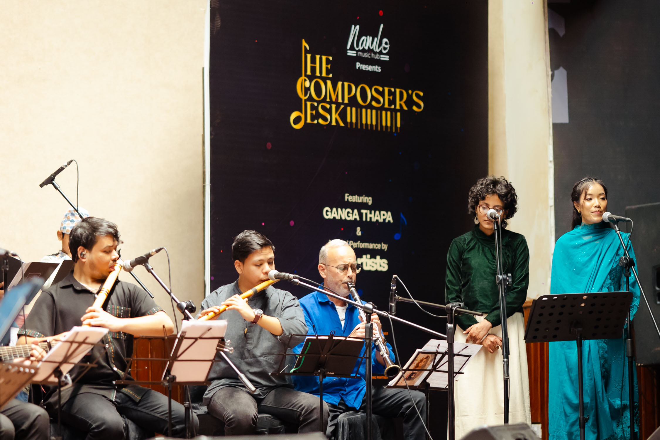 मञ्चमा झन्डै २५ संगीतज्ञ मुरलीदेखि सारंगी, मादलदेखि बाँसुरी, ड्रमसेटदेखि स्ट्रिङ सेक्सनसम्म सबैले एकै स्वरमा संगीतकारको दृष्टि र भावलाई जीवन्त बनाए। गंगा थापासँगै एइलिन थापा : सेलो, स्वर, फोबी श्रेष्ठ : भायोलिन, ईभा महर्जन : सेलो, रोश्ना शाक्य: भायोलिन, रवि श्रेष्ठ : डबल बेस, स्वर्णिम महर्जन : बाँसुरी, रुपेश शाक्य : बाँसुरी, फ्लुट, परास सुवेदी : मादल, सिजन महर्जन : पर्कसन (तालवाद्य), जोसेफ श्रेष्ठ : गितार, अश्विन : सारंगी, धनबहादुर गुरुङ : सहनई, स्टिभ अरास्तिया : क्ल्यारिनेट र गायक/स्वर कलाकारहरू, शिङ्ग्रोन पुन, पवन गिरी, अंशु कार्की, रेश्मा पुन, समीक्षा चौधरी, सन्तोष राना, पार्वती थापा, श्रुति प्रधानसँगै बालबालिकाहरुले पनि प्रस्तुति दिएका थिय।