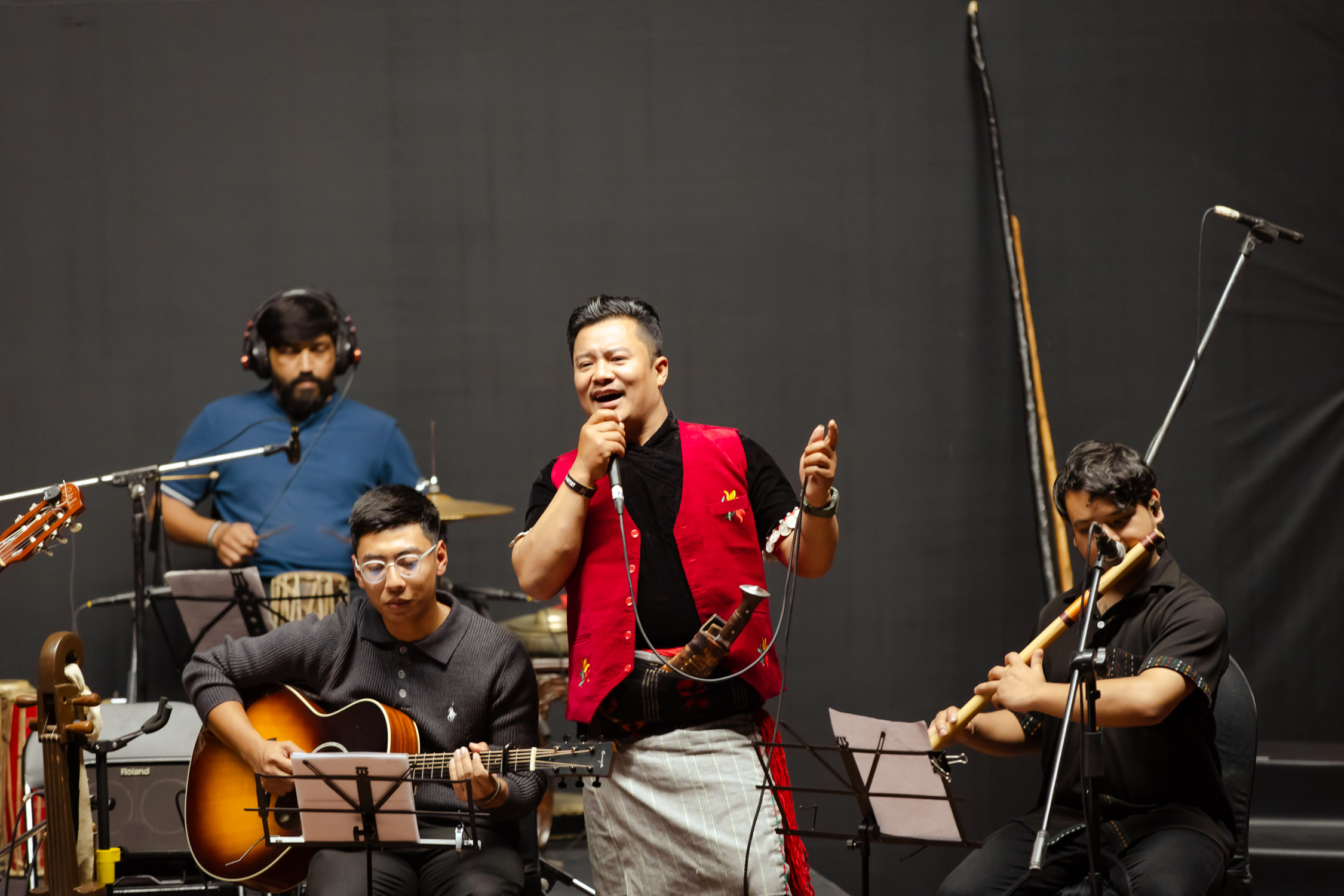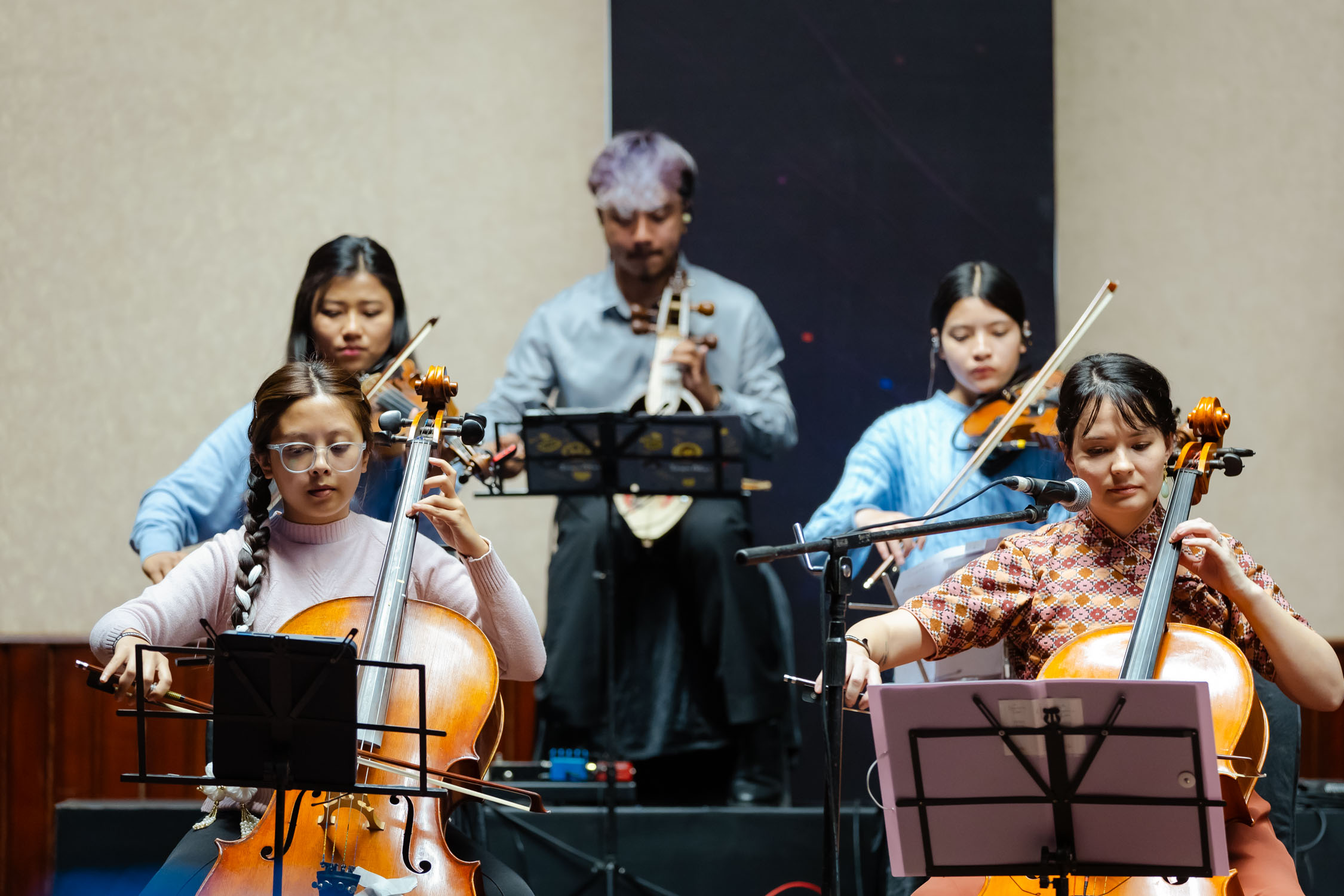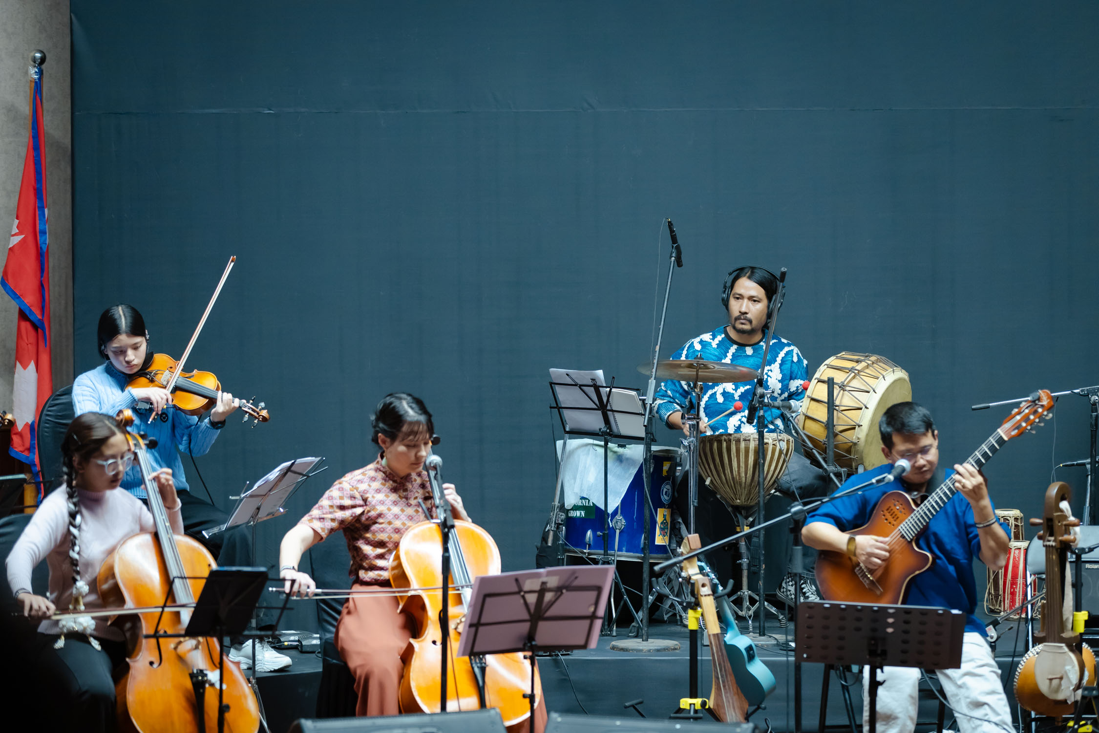 मञ्चमा झन्डै २५ संगीतज्ञ मुरलीदेखि सारंगी, मादलदेखि बाँसुरी, ड्रमसेटदेखि स्ट्रिङ सेक्सनसम्म सबैले एकै स्वरमा संगीतकारको दृष्टि र भावलाई जीवन्त बनाए। गंगा थापासँगै एइलिन थापा : सेलो, स्वर, फोबी श्रेष्ठ : भायोलिन, ईभा महर्जन : सेलो, रोश्ना शाक्य: भायोलिन, रवि श्रेष्ठ : डबल बेस, स्वर्णिम महर्जन : बाँसुरी, रुपेश शाक्य : बाँसुरी, फ्लुट, परास सुवेदी : मादल, सिजन महर्जन : पर्कसन (तालवाद्य), जोसेफ श्रेष्ठ : गितार, अश्विन : सारंगी, धनबहादुर गुरुङ : सहनई, स्टिभ अरास्तिया : क्ल्यारिनेट र गायक/स्वर कलाकारहरू, शिङ्ग्रोन पुन, पवन गिरी, अंशु कार्की, रेश्मा पुन, समीक्षा चौधरी, सन्तोष राना, पार्वती थापा, श्रुति प्रधानसँगै बालबालिकाहरुले पनि प्रस्तुति दिएका थिय।