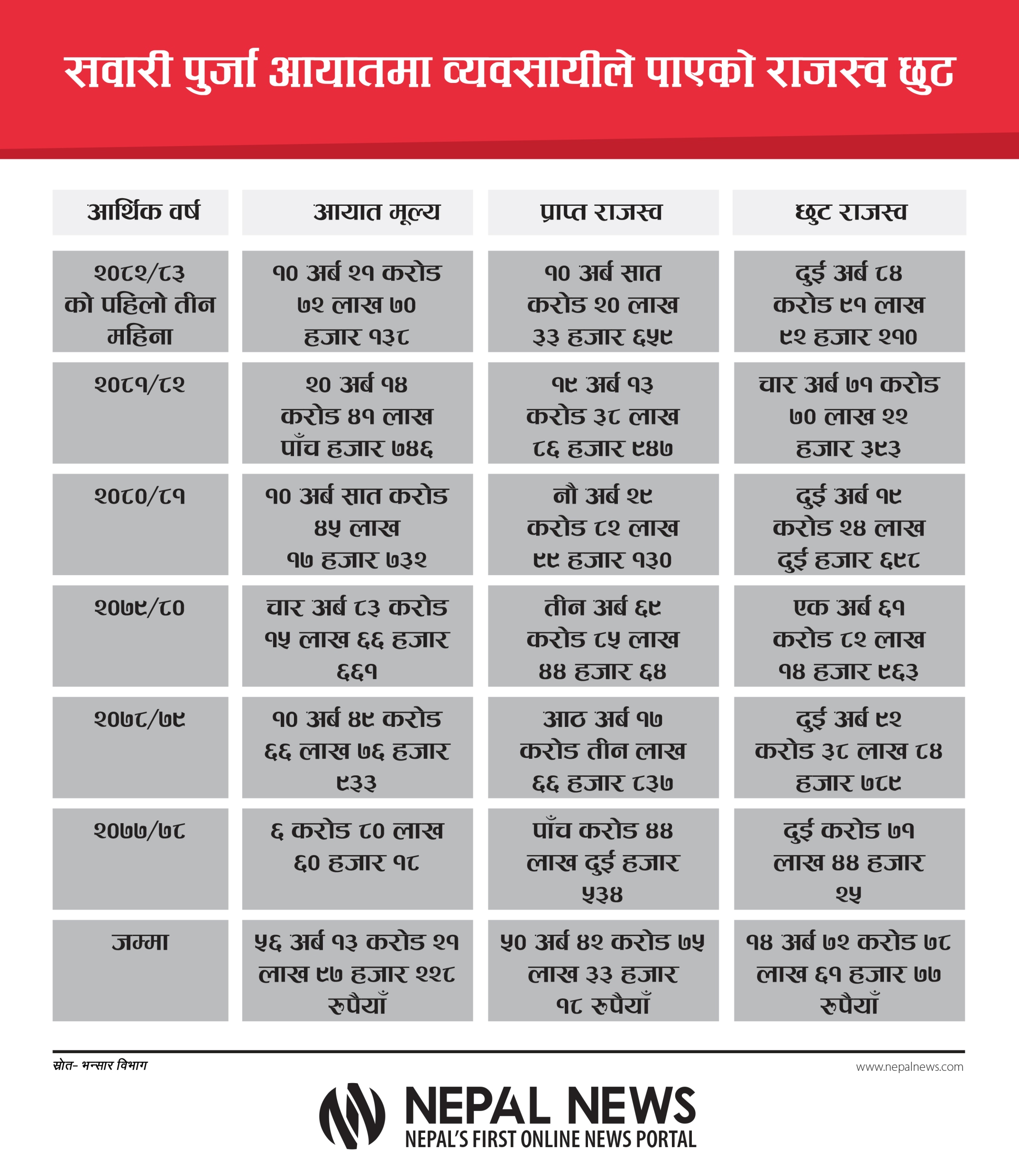 चालु आर्थिक वर्ष २०८२/८३ को तीन महिना (साउन–भदौ)मा मात्रै १० अर्ब २१ करोड ७२ लाख रुपैयाँको पुर्जा आयात भएको छ। उक्त मूल्य बराबरको सामान आयात हुँदा व्यवसायीले दुई अर्ब ८४ करोड ९१ लाख रुपैयाँ राजस्व छुट पाएको भन्सार विभागको तथ्यांक छ।