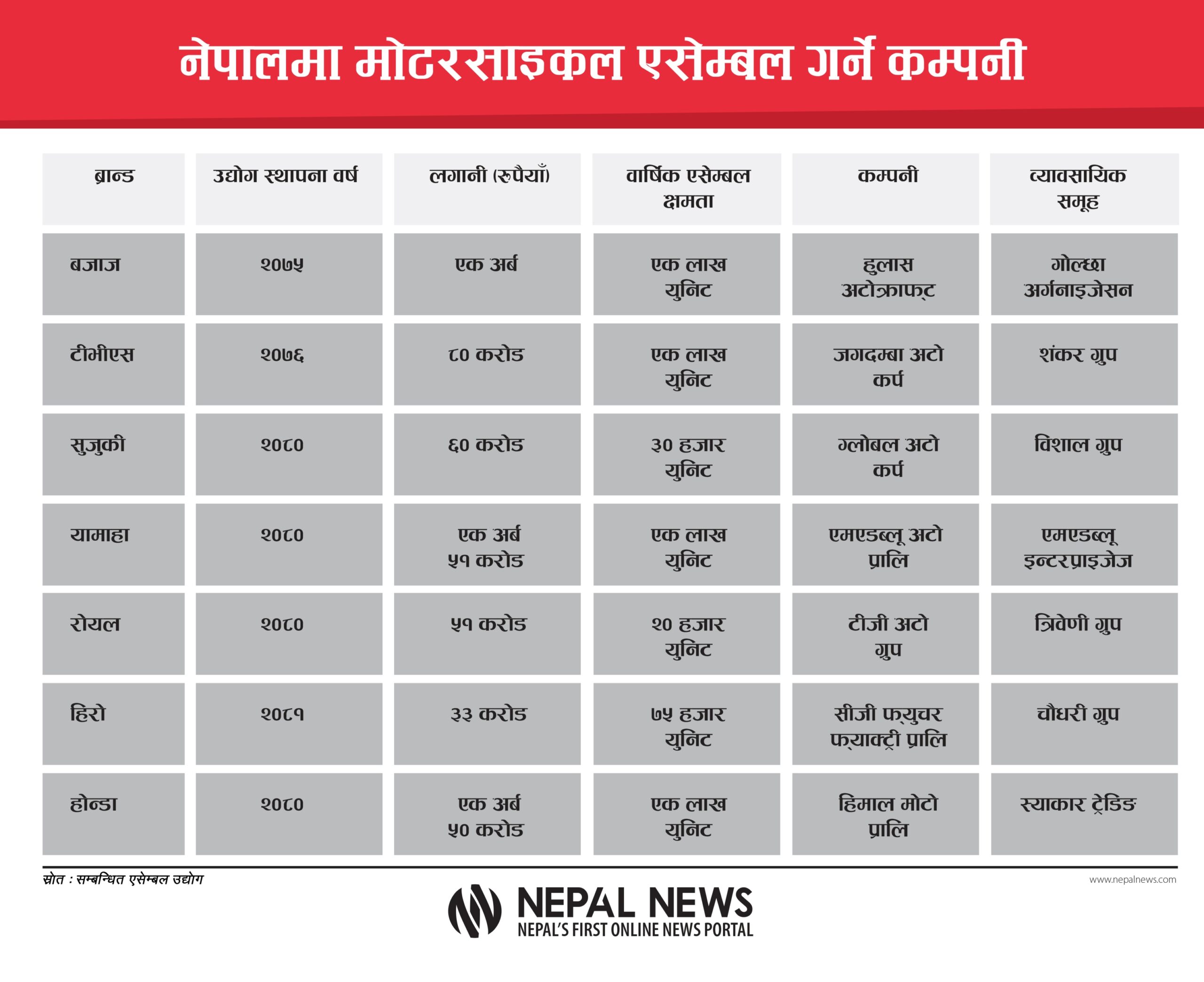 शंकर ग्रुपअन्तर्गत जगदम्बा अटोकर्पले टीभीएस ब्रान्डका मोटरसाइकल एसेम्बल गर्ने भन्दै २०७६ सालमा उद्योग खोल्यो। उक्त कम्पनीले वार्षिक २५ हजार वटा मात्रै उत्पादन गरिरहेको छ। त्यसबाहेक त्रिवेणी ग्रुपअन्तर्गत टीजी अटो ग्रुपले २०८० सालदेखि रोयल एन्फिल्ड एसेम्बल गर्दै आएको छ। मोरङ अटो वर्क्स (एमएडब्लू)ले यामाहा, ज्योति ग्रुपले होन्डा, विशाल ग्रुपले सुजुकी र चौधरी ग्रुपको सीजी मोटर्सले हिरो ब्रान्डका मोटरसाइल २०८१ देखि एसेम्बल गरिरहेका छन्।