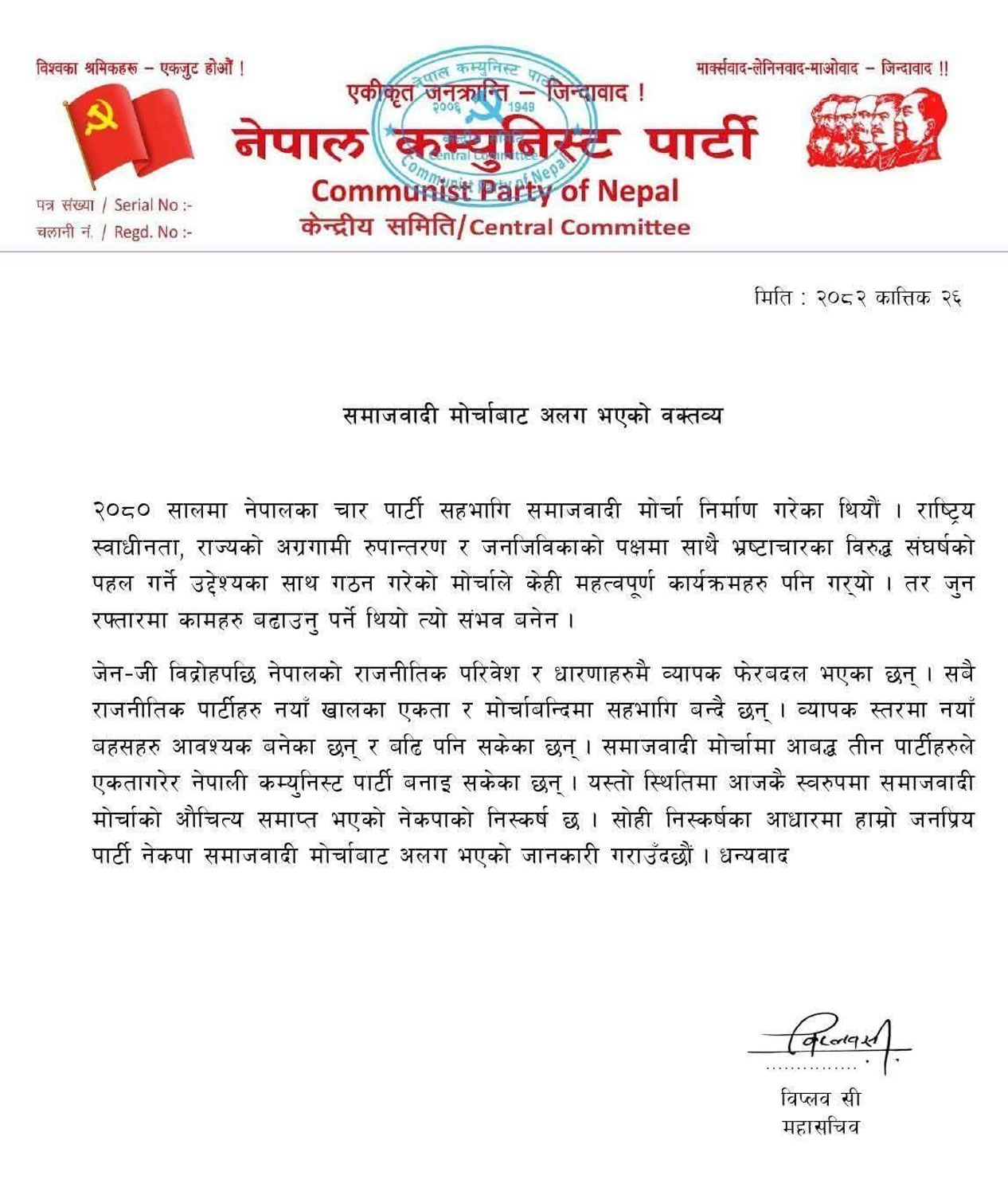 मोर्चामा आबद्ध चारमध्ये तीन पार्टीले नेपाली कम्युनिस्ट पार्टीसमेत बनाइसकेको अवस्थामा मोर्चाको औचित्य नभएको उनले उल्लेख गरेका छन् । “आजकै स्वरुपमा समाजवादी मोर्चाको औचित्य समाप्त भएको नेकपाको निष्कर्ष छ । सोही निष्कर्षका आधारमा हाम्रो जनप्रिय पार्टी नेकपा समाजवादी मोर्चाबाट अलग भएको जानकारी गराउँदछौँ,” विज्ञप्तिमा भनिएको छ ।