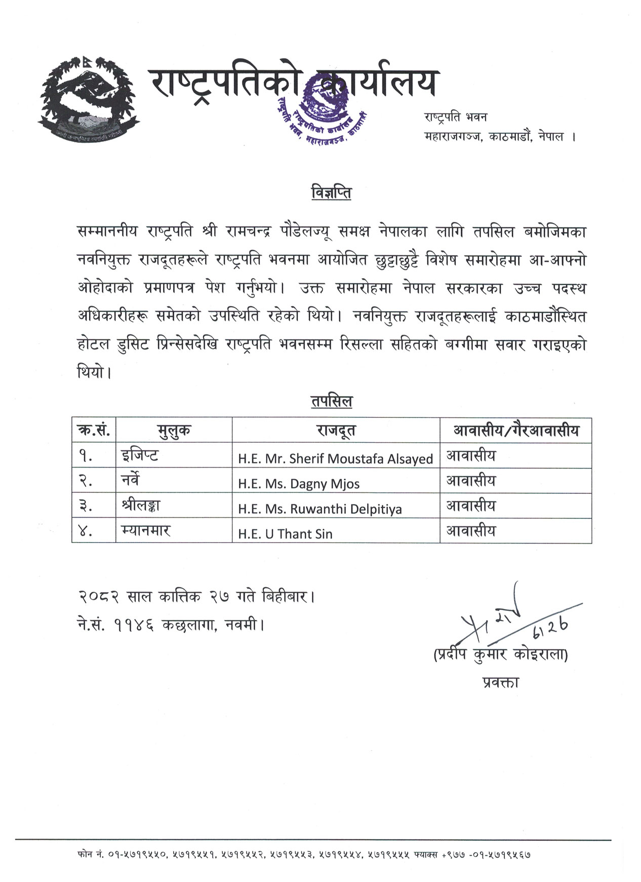 नेपालका लागि इजिप्टका राजदूत सरिफ मुस्तफा अलसैयद, नर्वेकी राजदूत डाग्नी म्योस, श्रीलंकाकी राजदूत रुवान्थी डेलपिटिया र म्यानमारका राजदूत थान्त सिनले आ-आफ्नो ओहोदाको प्रमाणपत्र पेस गरेका हुन्। उक्त समारोहमा सरकारका उच्च पदस्थ अधिकारहरूसमेत सहभागी थिए।