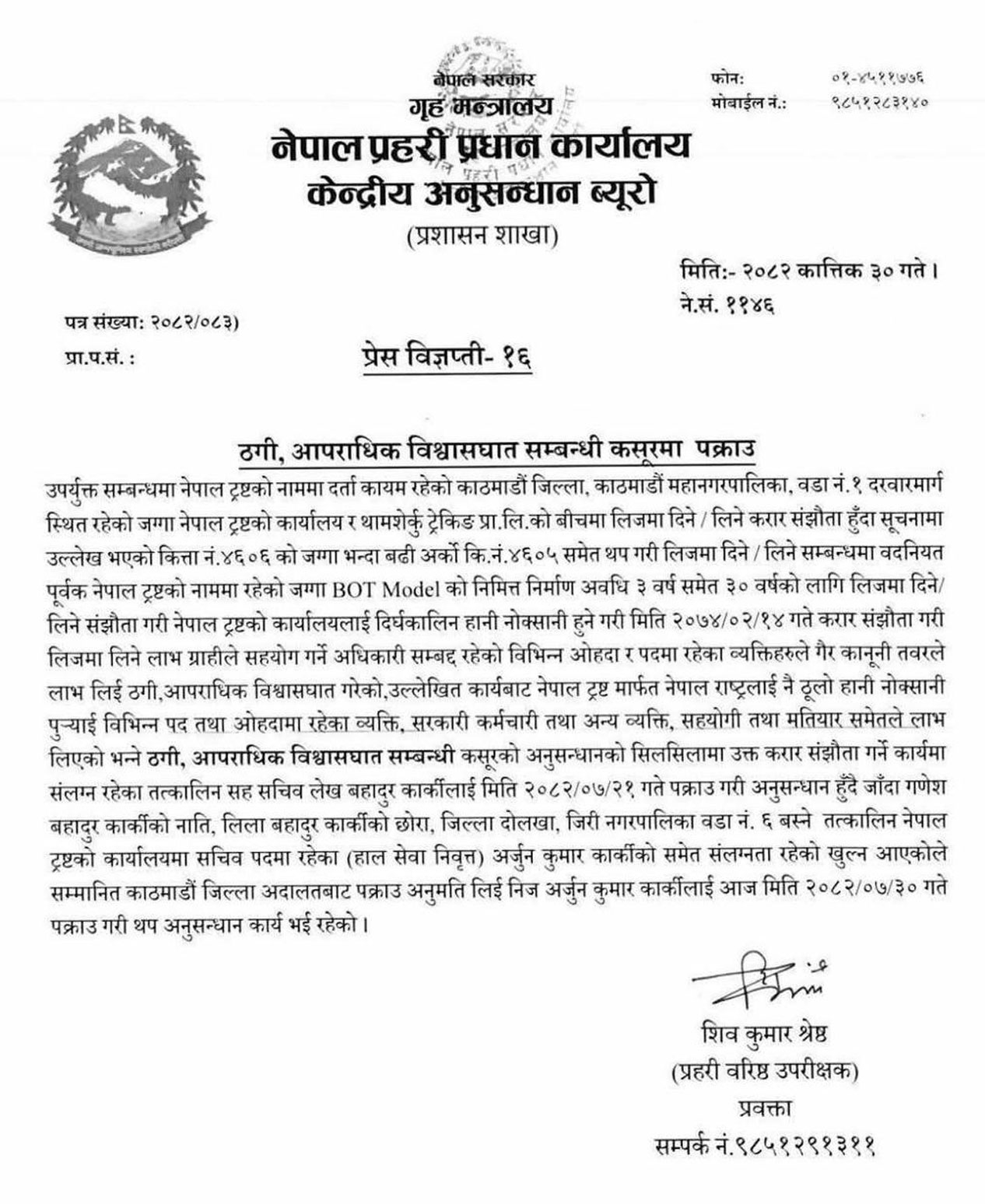 दरबारमार्गस्थित ट्रस्टको जग्गा नेपाल ट्रस्ट र श्यामशेर्कु ट्रेकिङ प्रालिलाई लिजमा दिने सम्झौता हुँदा अनियमिता गरेको आरोप लागेपछि प्रहरीले अनुसन्धान थालेको थियो।