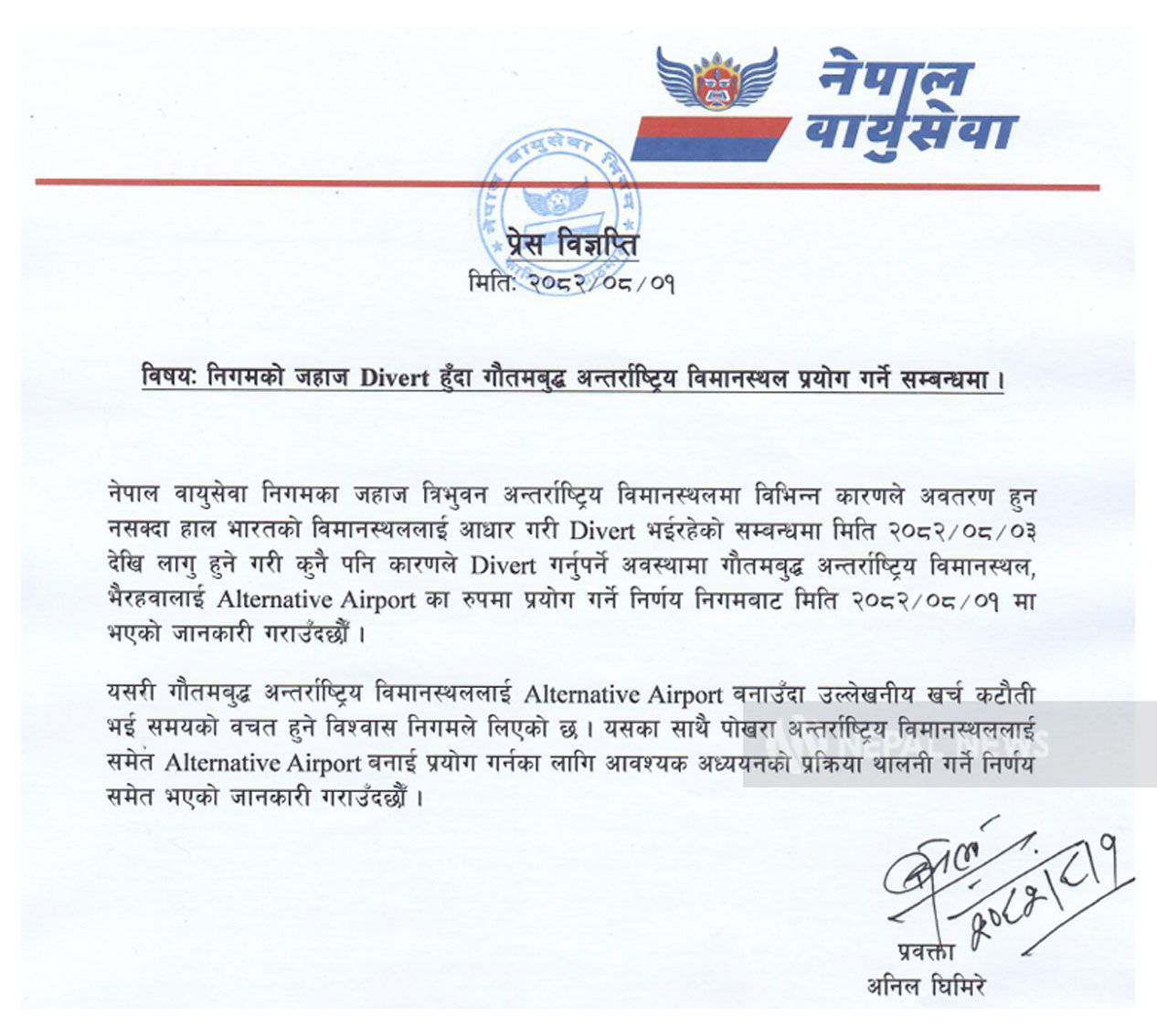 निगम व्यवस्थापनले त्रिभुवन विमानस्थलमा अवतरण हुन नसकी डाइभर्ट गर्नुपर्ने अवस्था आए भैरहवामा विमानस्थलमा अवतरण गराउन भनेको हो। त्रिभुवन विमानस्थलबाट डाइभर्ट भएका विमान अवतरणका लागि पोखरा अन्तर्राष्ट्रिय विमानस्थलमा सम्भव हुने/नहुने विषयमा पनि निगमले अध्ययन गर्नेछ ।