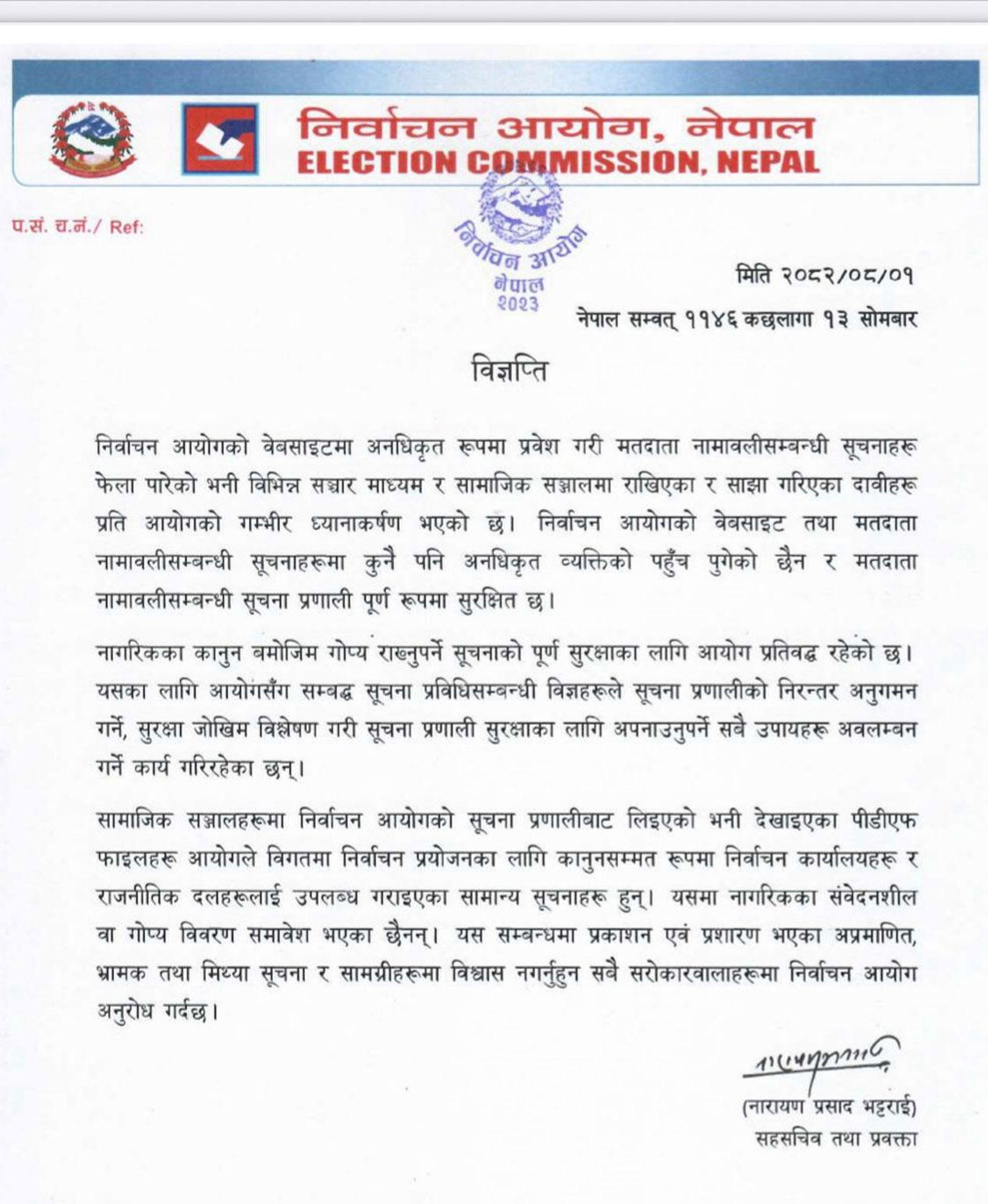 आयोगको वेबसाइटमा अनधिकृत प्रवेश गरी मतदाता नामावलीसम्बन्धी सूचना फेला पारेको भनी सामाजिक सञ्जालमा आएका दाबीप्रति आयोगको गम्भीर ध्यानाकर्षण भएको जनाएको हो। आयोगले सूचना प्रणाली पूर्ण सुरक्षित रहेको पनि विज्ञप्तिमार्फत जनाएको छ।