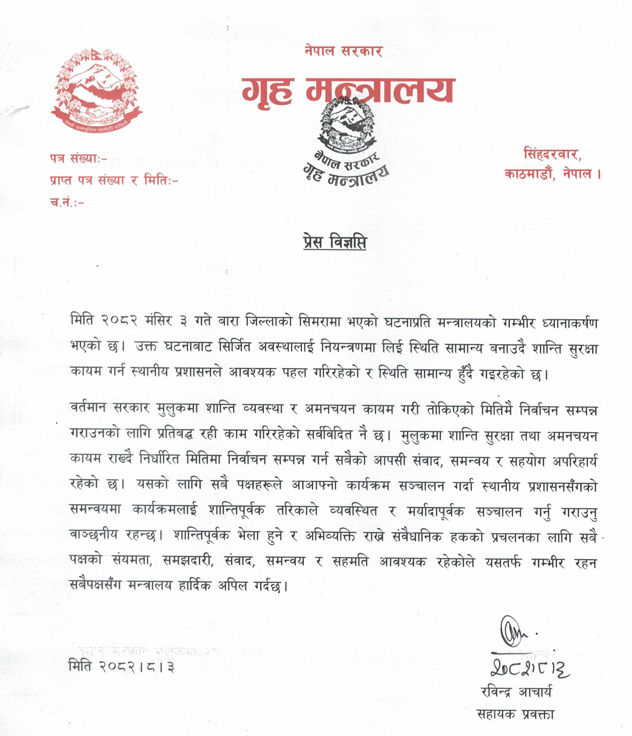 मन्त्रालयका सहायक प्रवक्ता रवीन्द्र आचार्यद्वारा जारी विज्ञप्तिमा वर्तमान सरकार मुलुकमा शान्ति व्यवस्था र अमनचयन कायम गरी तोकिएको समयमै निर्वाचन सम्पन्न गराउन प्रतिबद्ध रहेको स्पष्ट पारिएको छ।