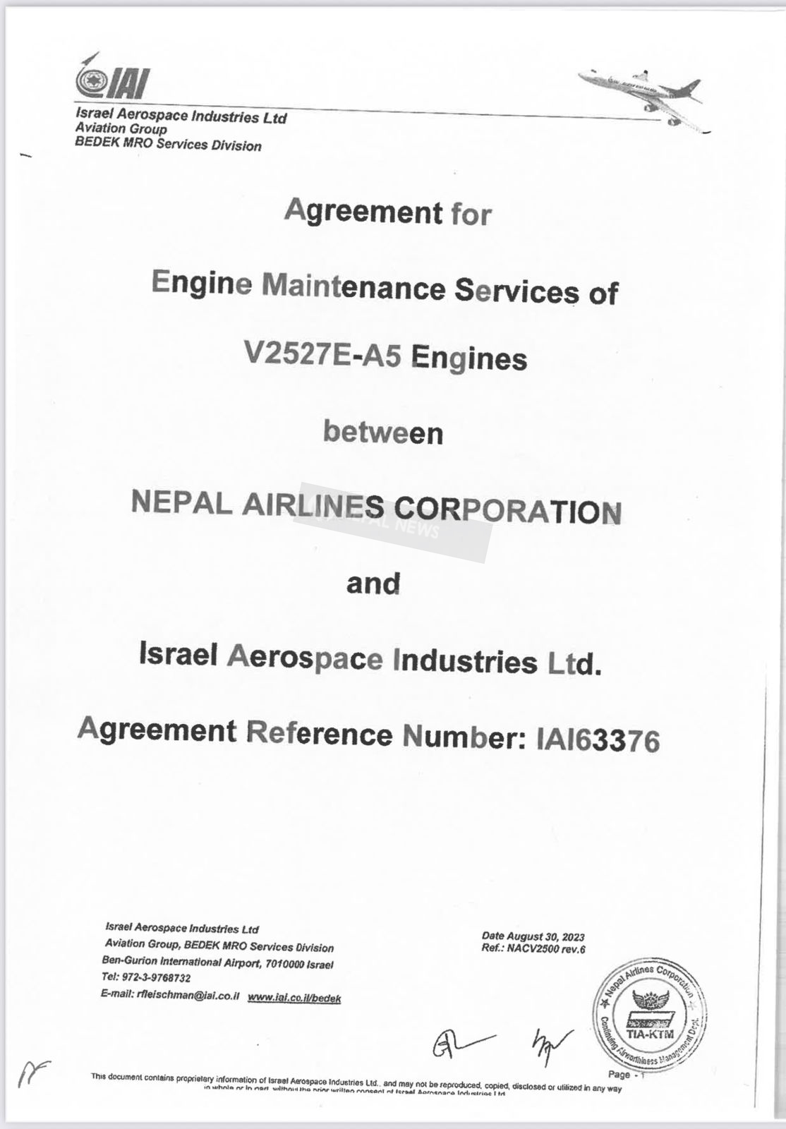 नेपाल वायुसेवा निगम र इजरायल एरोस्पेस इन्डस्ट्रिजबीच भएको इन्जिन मर्मत सम्झौता