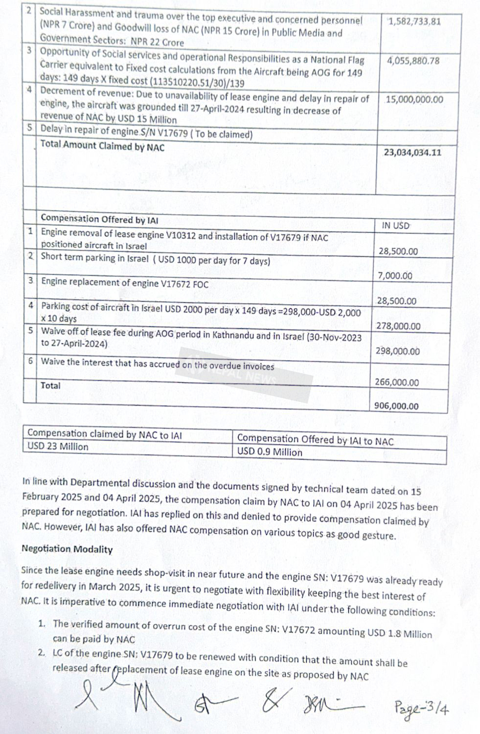 आईएआईले पार्टस् अभाव भएको भन्दै तेस्रोपटकको इन्जिन मर्मत गर्न धेरै समय लगायो। यता निगम नेतृत्वले आईएआईसँग क्षतिपूर्ति दाबी गर्यो। आईएआईसँग तत्कालीन कार्यकारी अध्यक्ष अधिकारीले मर्मत र लिजभन्दा दोब्बर बढी रकम क्षतिपूर्तिस्वरूप दाबी गरे। क्षतिपूर्ति रकमको सूची देखेर आईएआई झस्कियो। यसपछि मर्मत र लिज दुवैको रकम भुक्तानी गर्न उसले दबाब दिन थाल्यो। ७ कात्तिकमा अधिकारी जब अवकाशमा जाँदै थिए, त्यसअघि आईएआईले भुक्तानीमा थप दबाब बढाएको देखिन्छ। क्षतिपूर्ति पहिले मागेर निगमले लिज र मर्मतको रकम भुक्तानी गरेन। यसपछि आईएआईले सम्झौताको समय छँदै ५ कात्तिक २०८२ मा (२२ अक्टोबर २०२५) रद्द गरेको एकपक्षीय निर्णय पठाएको छ।