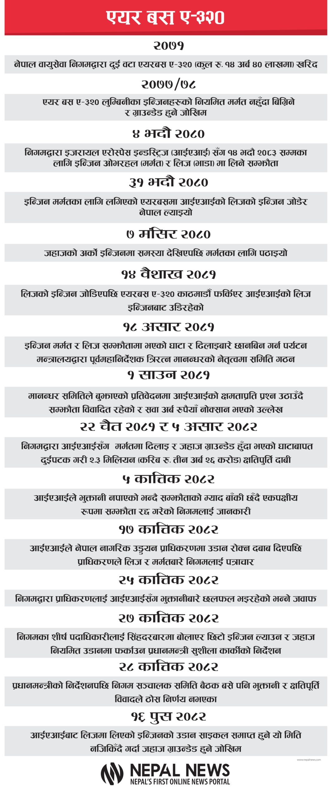 इजरायलको कम्पनीमा डेढ वर्षदेखि थन्किएको नेपाल वायुसेवा निगमको एयरबस ए-३२० को इन्जिनले सिंहदरबार हल्लाएको छ। इजरायलको एयरस्पेस इन्डस्ट्रिज (आईएआई)मा मर्मतपछि पनि थन्क्याएर लिजको इन्जिनमा उडिरहेको निगमको ए-३२० भूमिस्थ (ग्राउन्डेड) हुने संकट चुलिँदै गएपछि प्रधानमन्त्री सुशीला कार्कीले नै हस्तक्षेप गर्नुपर्यो। २७ कात्तिकमा निगमका शीर्ष पदाधिकारीलाई सिंहदरबारमै बोलाएर उनले जसरी भए पनि भुक्तानी गरेर इन्जिन ल्याउन निर्देशन दिइन्।
