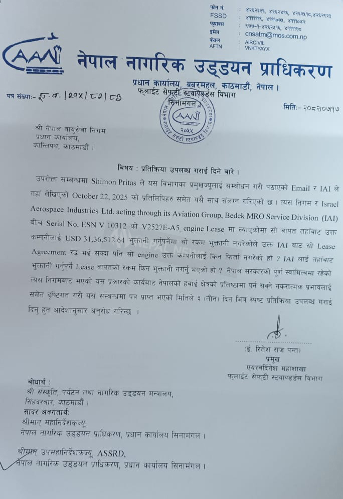 आईएआईले निगमलाई ५ कात्तिक २०८२ (२२ अक्टोबर २०२५)मा चिठी लेखेर यथाशीघ्र इन्जिन फिर्ता गर्न दबाब दिएको थियो। निगमबाट जवाफ नआएको भन्दै उक्त कम्पनीले जहाज उडानमा रोक लगाइदिन नेपाल नागरिक उड्डयन प्राधिकरणमा दबाब बढाएको छ। आईएआईले प्राधिकरणका महानिर्देशक प्रदीप अधिकारीलाई नै इमेल लेखेको छ।