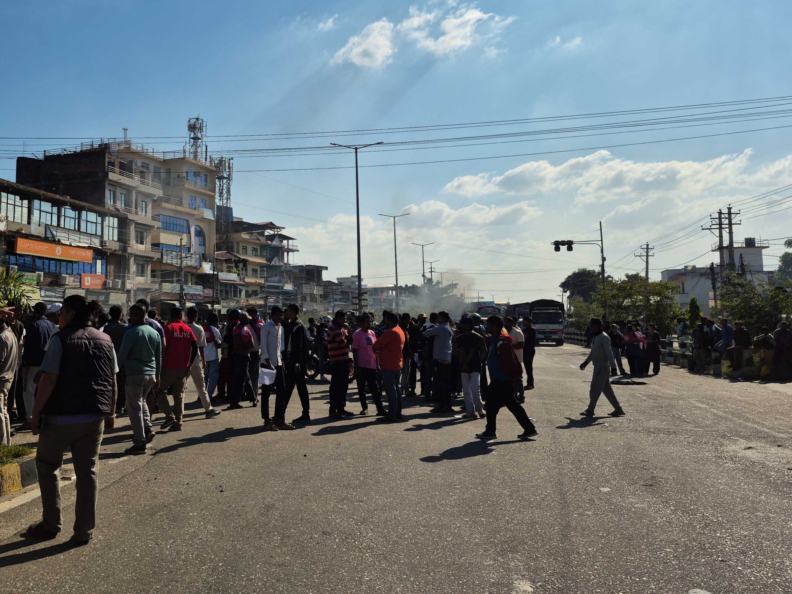 प्रदर्शनमा उत्रिएका जेन-जी समूहले सडकमा टायर बालेका छन्। प्रदर्शनकारी र एमाले कार्यकर्ताबीच झडप हुँदा यस क्षेत्रको अवस्था तनावग्रस्त बनेको छ।