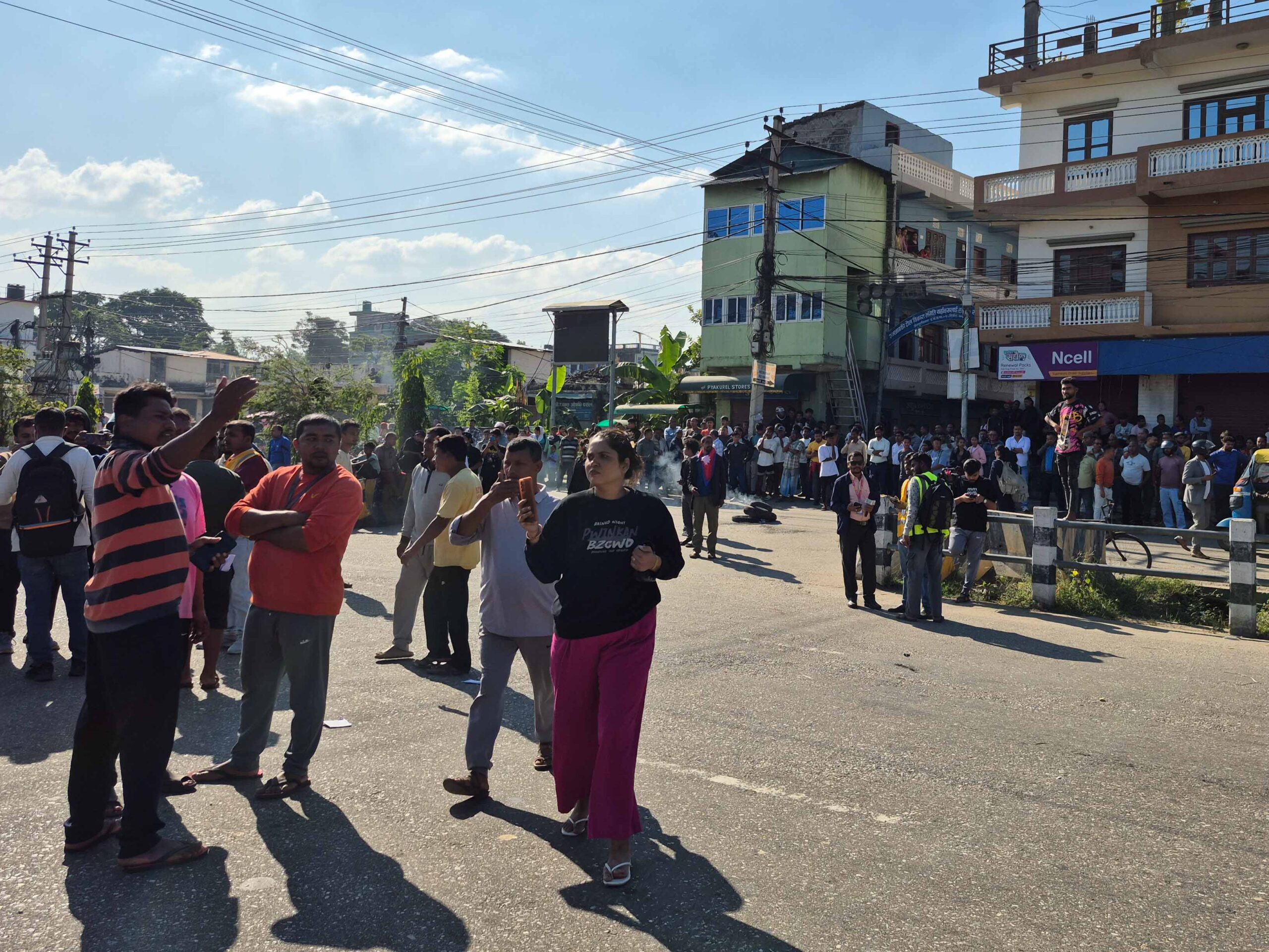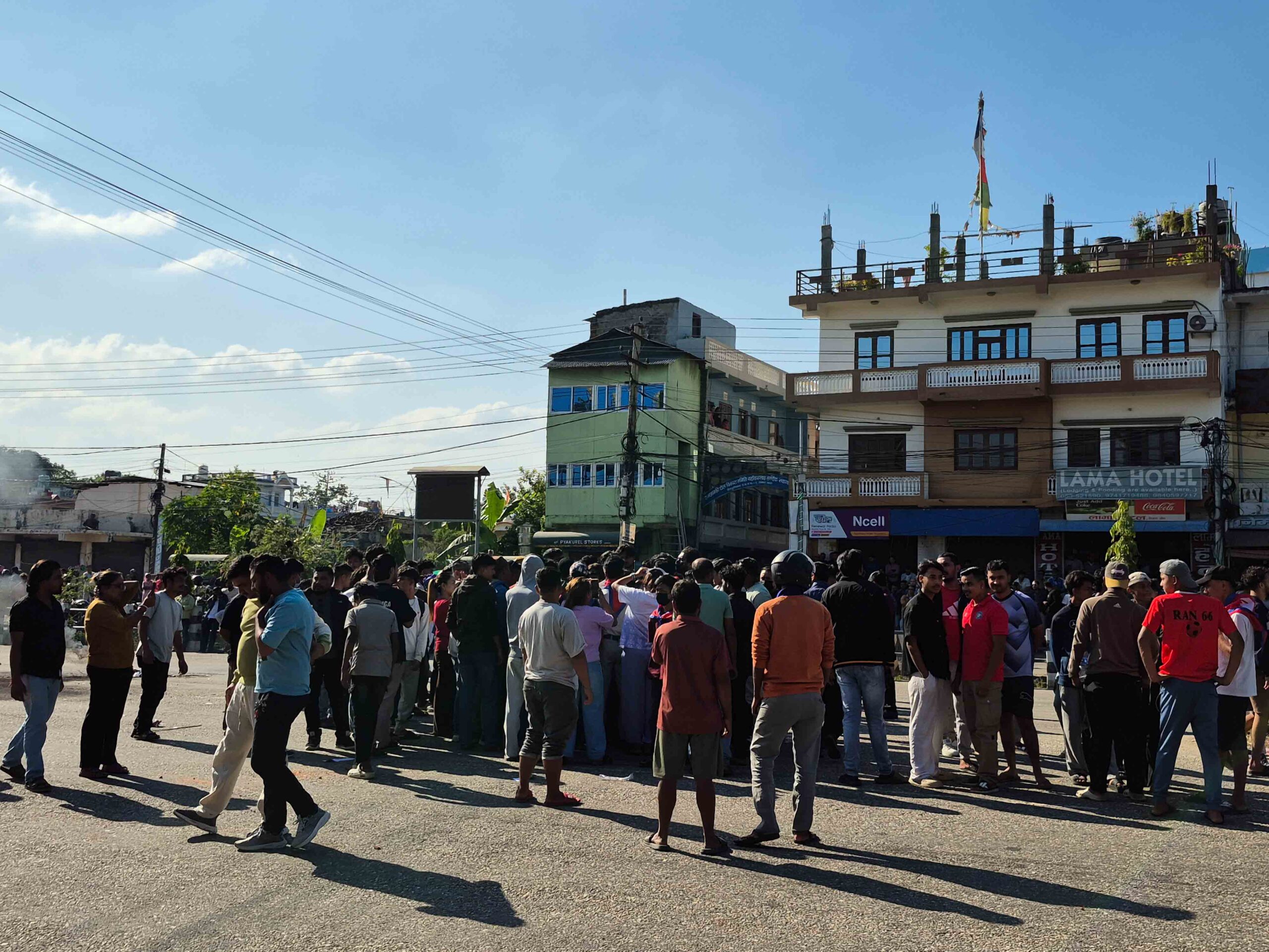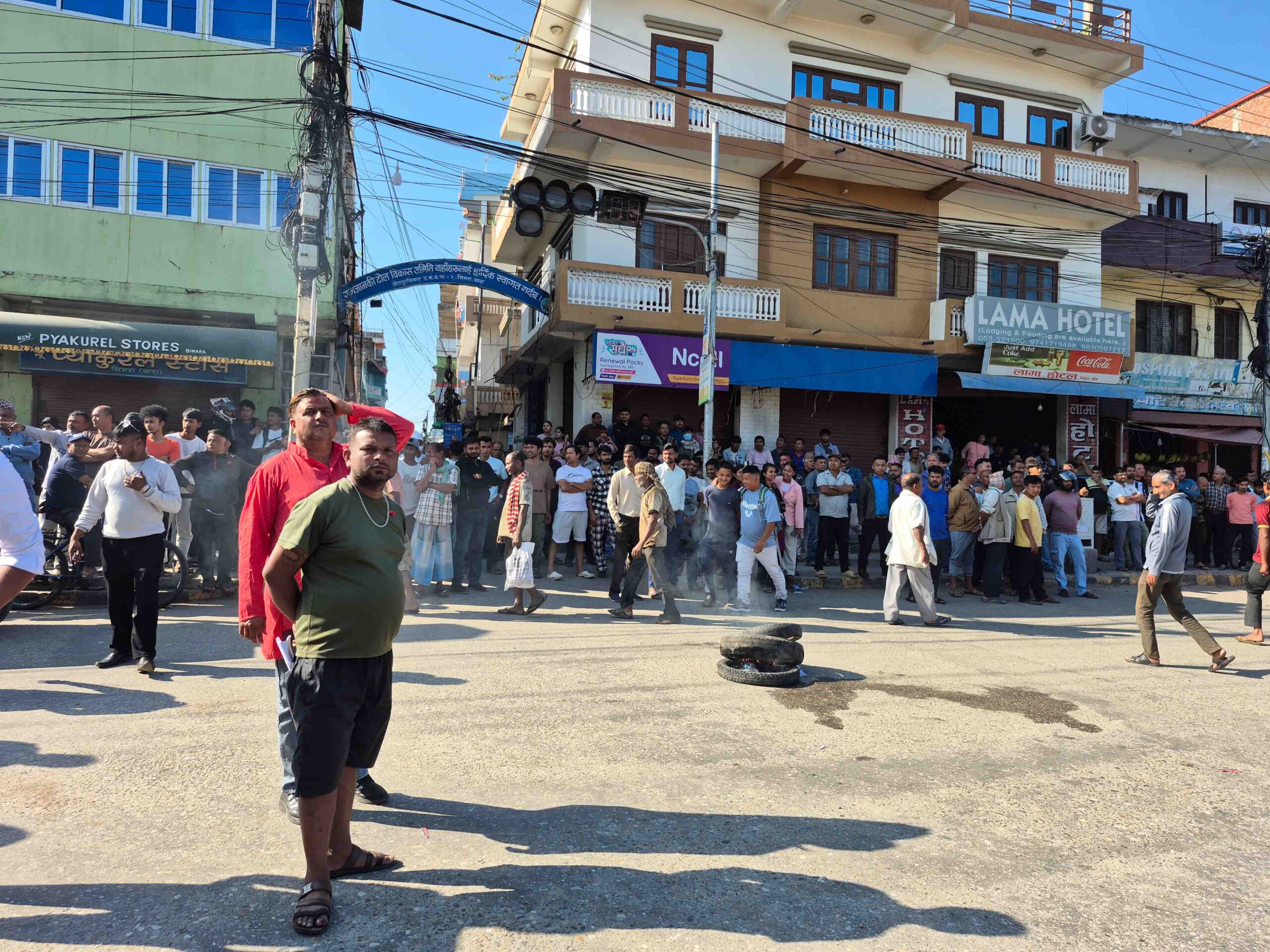 प्रदर्शनमा उत्रिएका जेन-जी समूहले सडकमा टायर बालेका छन्। प्रदर्शनकारी र एमाले कार्यकर्ताबीच झडप हुँदा यस क्षेत्रको अवस्था तनावग्रस्त बनेको छ।