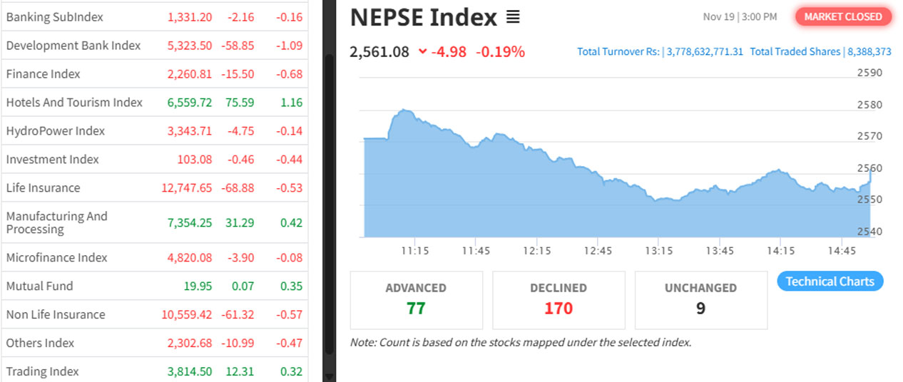 काठमाडौं। साताको चौथो कारोबार दिन आज (बुधबार) नेप्से ४.९८ अंकले घटेको छ। ०.१९ प्रतिशतले घटेको नेप्से २५६१.०८ विन्दुमा रोकिएको छ।