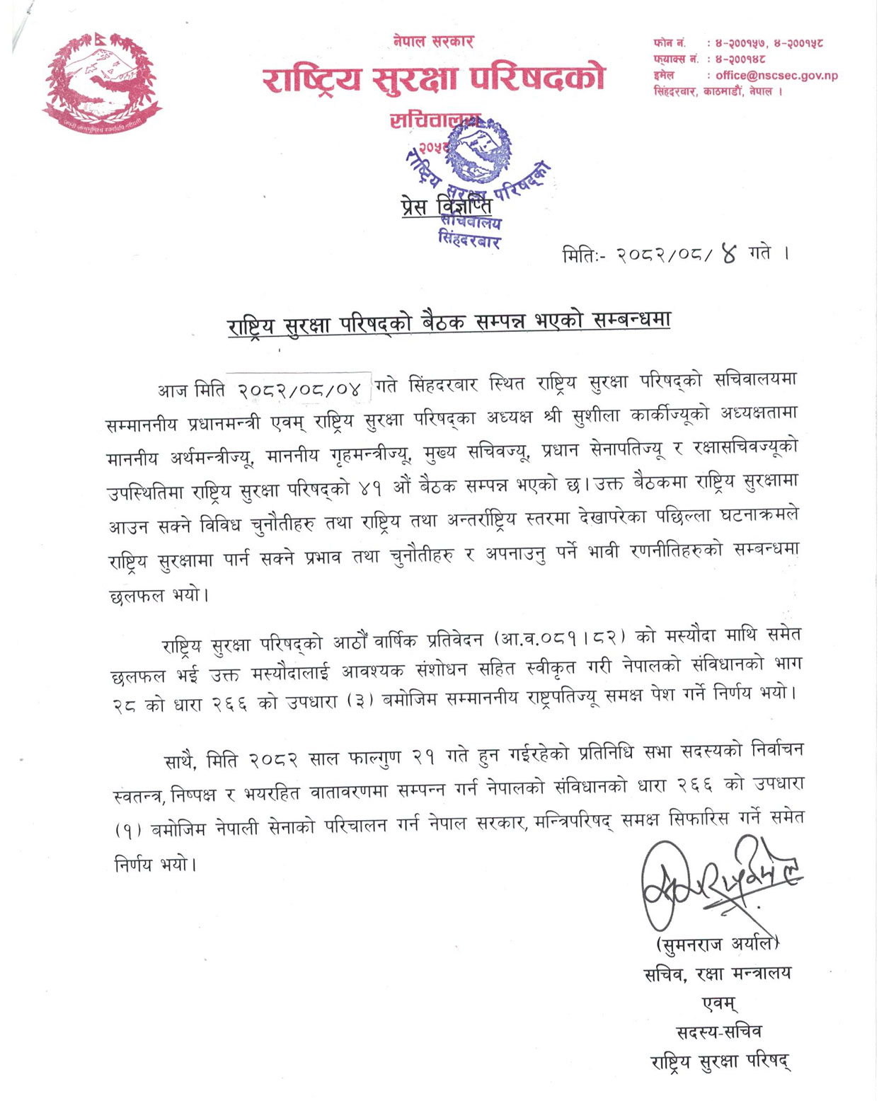 उनका अनुसार निर्वाचनका संवेदनशील केन्द्रहरूमा सुरक्षा सुदृढ गर्न सेना परिचालन आवश्यक देखिएको निष्कर्ष बैठकले निकालेको छ। प्रधानमन्त्री सुशीला कार्कीको अध्यक्षतामा बसेको बैठकमा अर्थमन्त्री रामेश्वर खनाल, गृहमन्त्री ओमप्रकाश अर्याल, मुख्य सचिव एकनारायण अर्याल, प्रधानसेनापति अशोकराज सिग्देल र रक्षा-सचिव सुमनराज अर्यालको सहभागिता थियो।