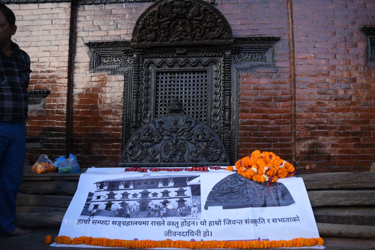 बाजा बजाएर पूजा गरेपछि कुमारी घरको मुख्य ढोकाको दायाँपट्टि रहेको झ्यालमाथिको उक्त तोरण पुन:स्थापना गरिएको छ।