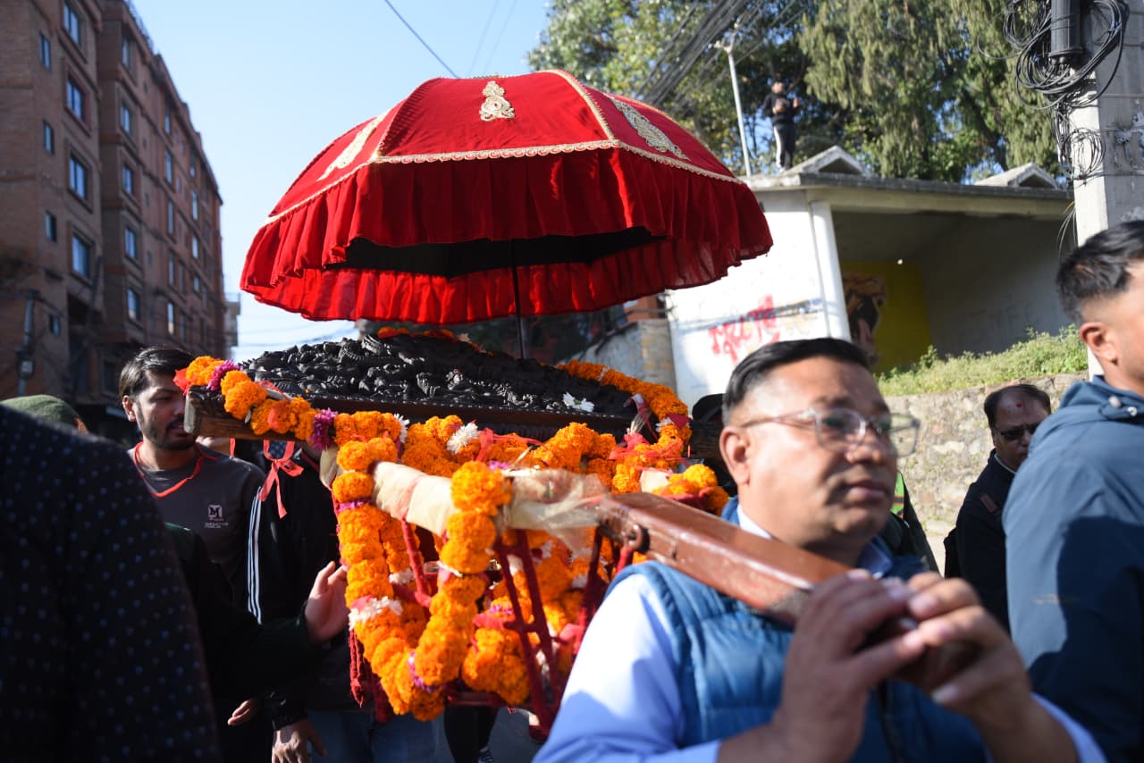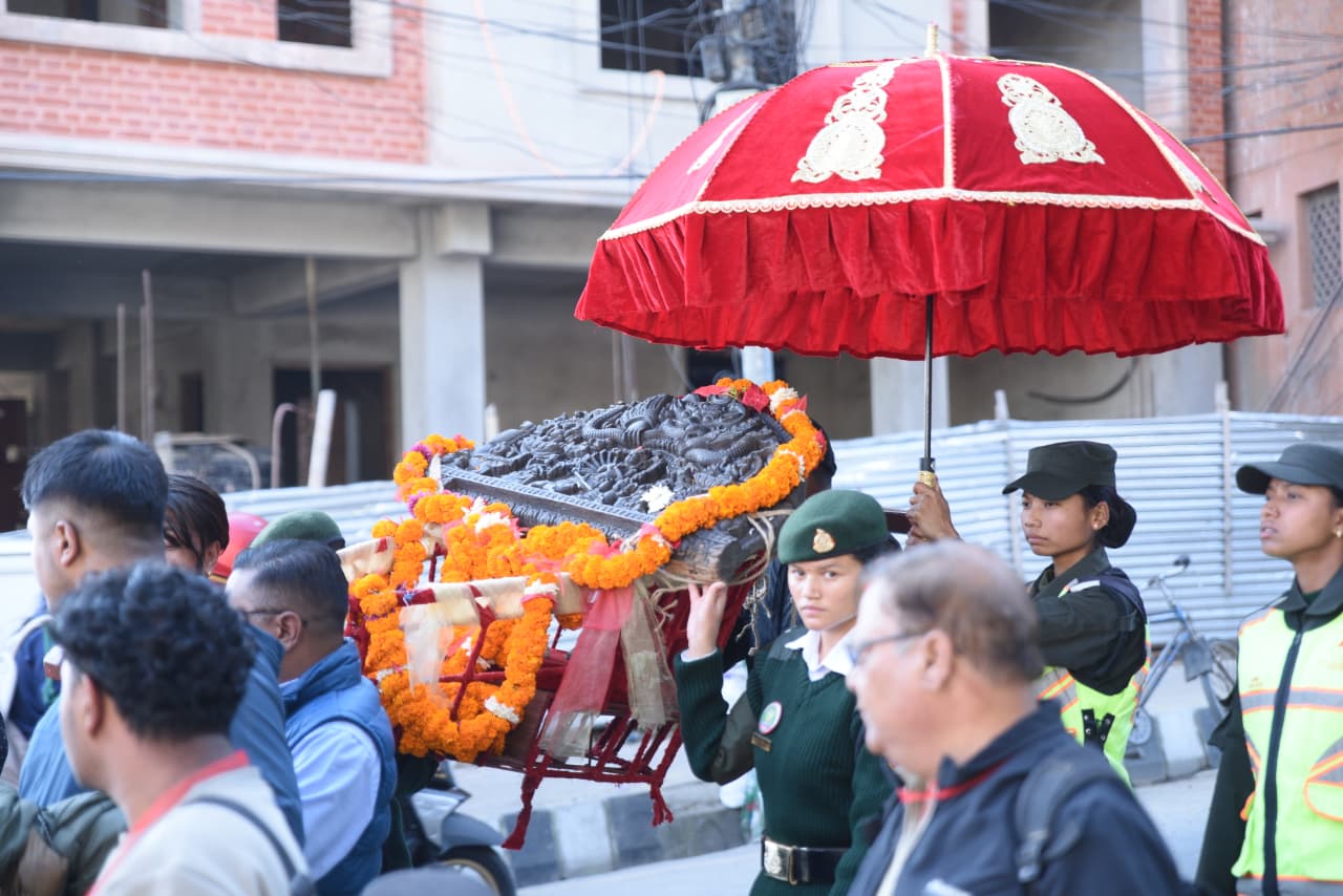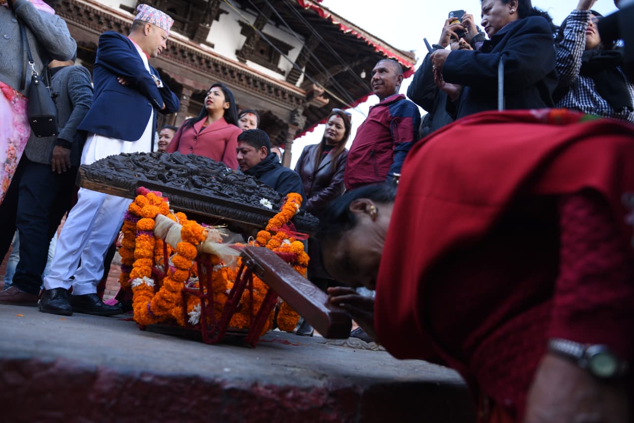 बाजा बजाएर पूजा गरेपछि कुमारी घरको मुख्य ढोकाको दायाँपट्टि रहेको झ्यालमाथिको उक्त तोरण पुन:स्थापना गरिएको छ।