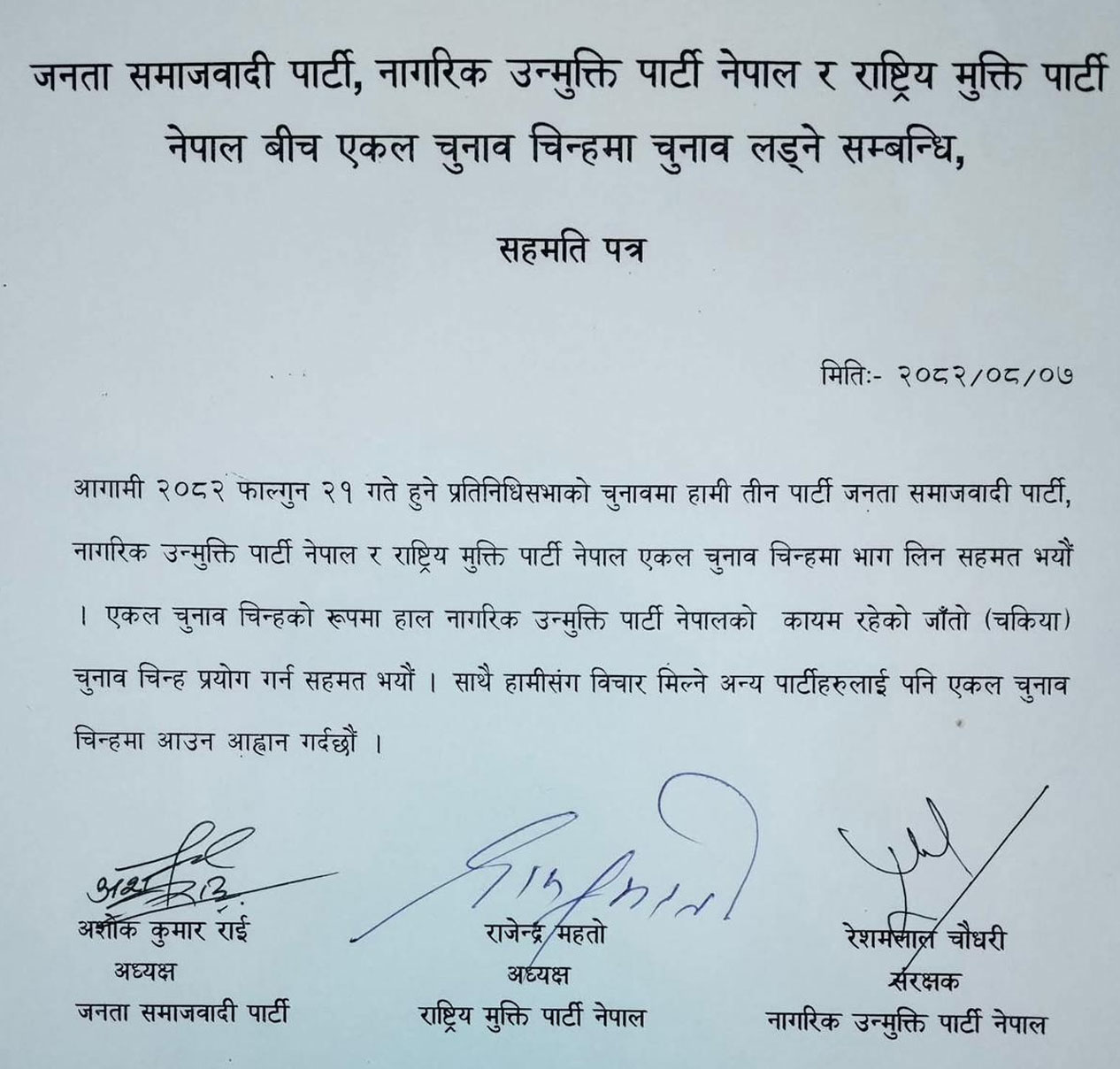 जसपा अध्यक्ष राई, राष्ट्रिय मुक्ति पार्टीका अध्यक्ष महतो र नाउपा नेपालका संरक्षक चौधरीले एउटै चुनाव चिह्न लिएर निर्वाचनमा सहभागी हुन आइतबार सहमतिपत्रमा हस्ताक्षर गरेका हुन्।