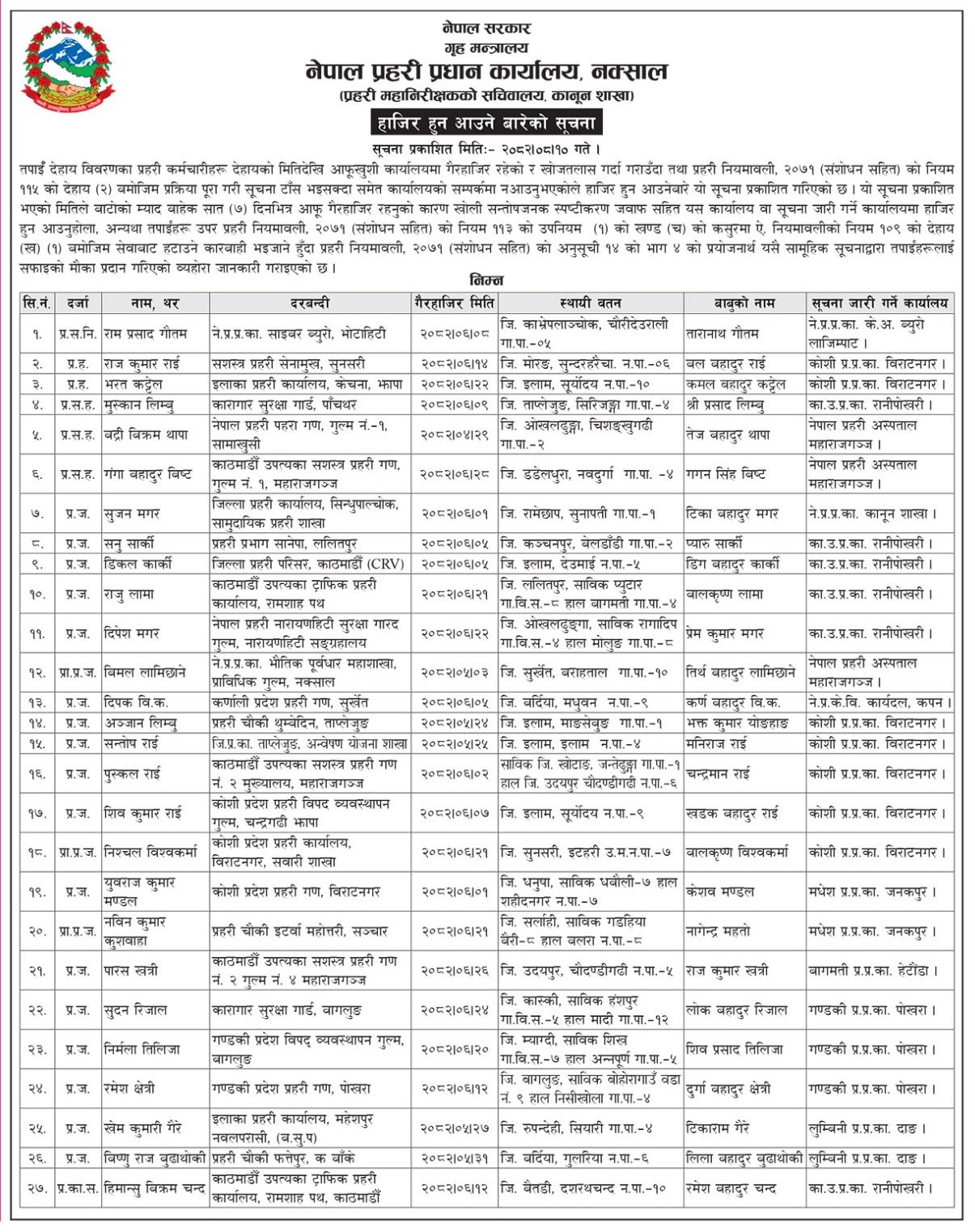 भदौ र असोज महिनाका विभिन्न मितिमा बिदा लिएर बिदा सकिँदासमेत कार्यालयमा हाजिर नभए पछि प्रहरी प्रधान कार्यालयले सूचना जारी गरेको हो।