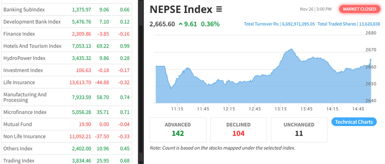 काठमाडौं। साताको चौथो कारोबार दिन आज (बुधबार) पनि सेयर बजार बढेको छ। यो साता नेप्से लगातार बढिरहेको छ। आइतबार ३९.९२‚ सोमबार ५०.४४ तथा मंगलबार ५.३२ अंकले बढेको नेप्से बुधबार पनि ९.६१ अंकले बढ्यो। ०.३६ प्रतिशतले बढेको नेप्से २६६५.६० विन्दुमा कायम छ।