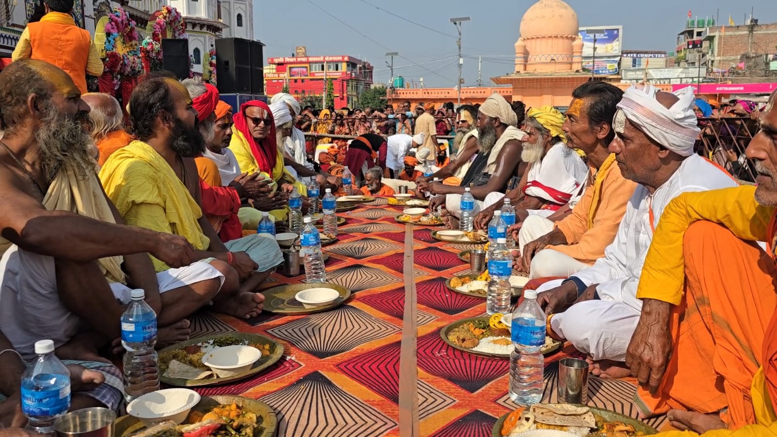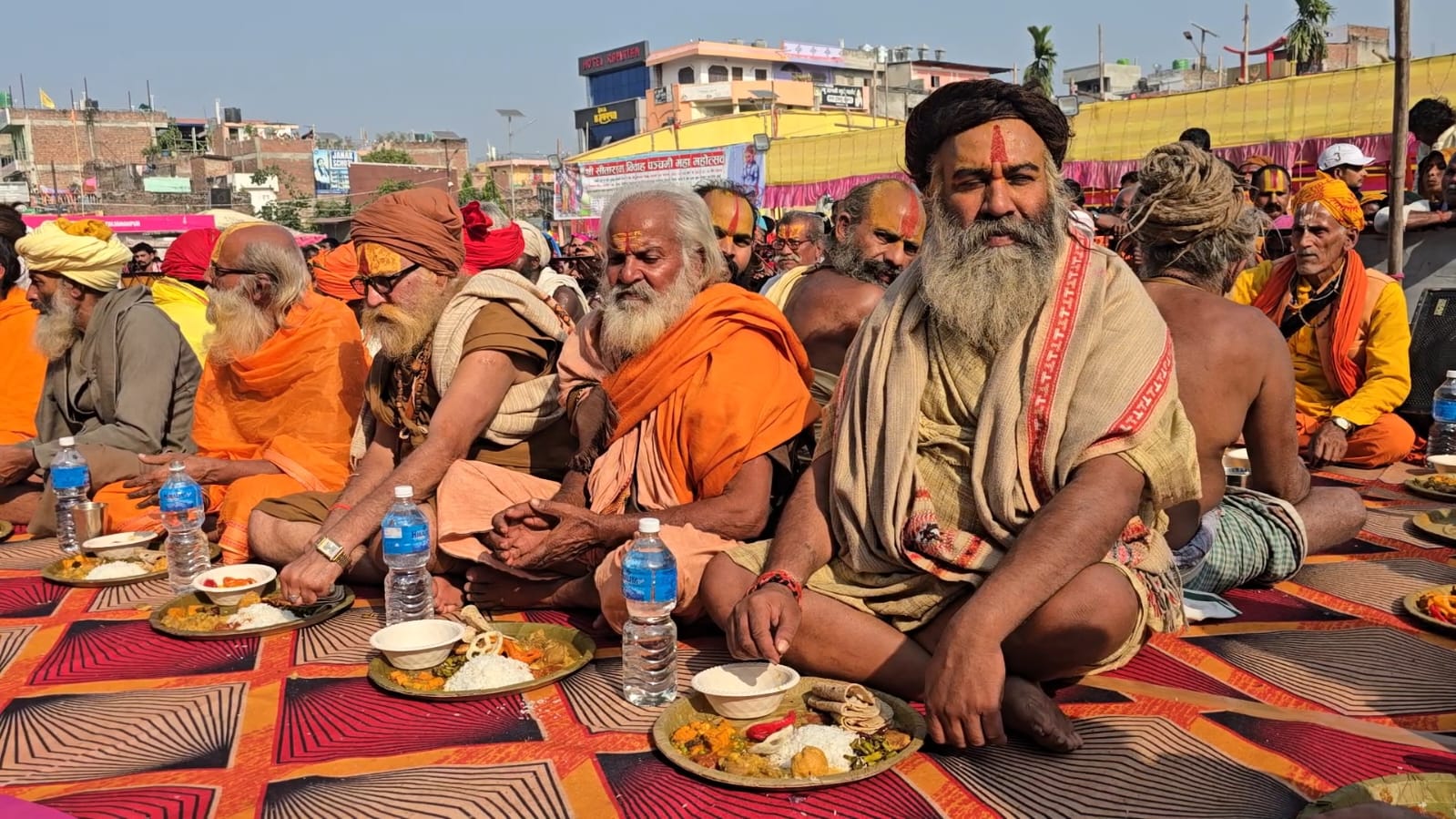 बिदाइ कार्यक्रममा भोजन गरिरहेका साधुसन्त। तस्बिर : वीरेन्द्र रमण