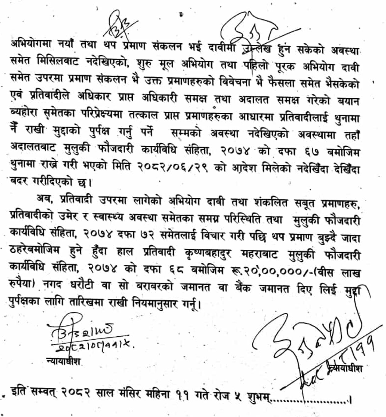 काठमाडौँ। पूर्वसभामुख कृष्णबहादुर महरालाई २० लाख रुपैयाँ धरौटीमा छाड्न उच्च अदालत पाटनले आदेश दिएको छ।