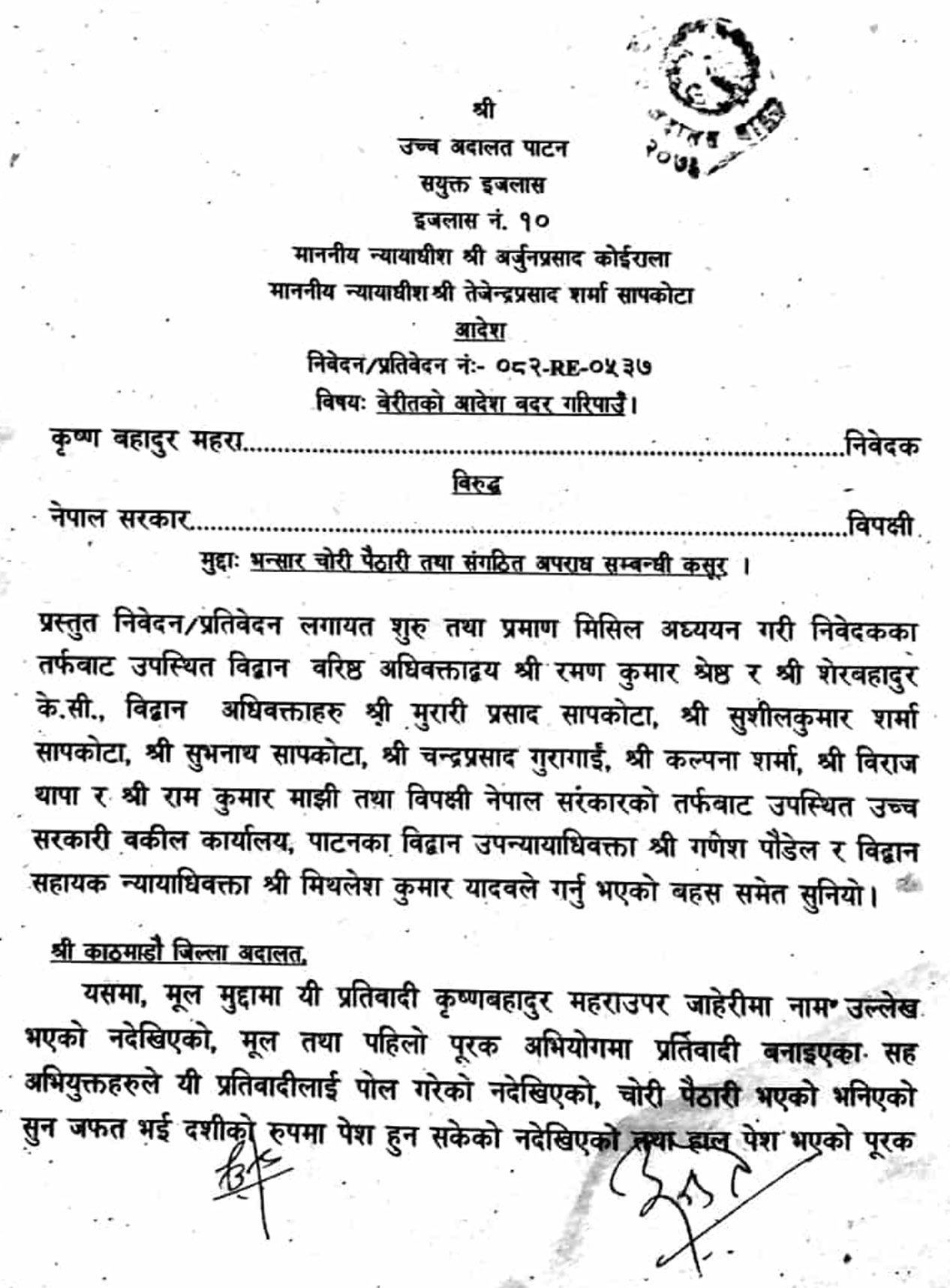 न्यायाधीयशद्वय अर्जुनप्रसाद कोइराला र तेजेन्द्रप्रसाद शर्मा सापकोटाको संयुक्त इजलासले बिहीबार महरालाई धरौटीमा छाड्न आदेश दिएको हो।