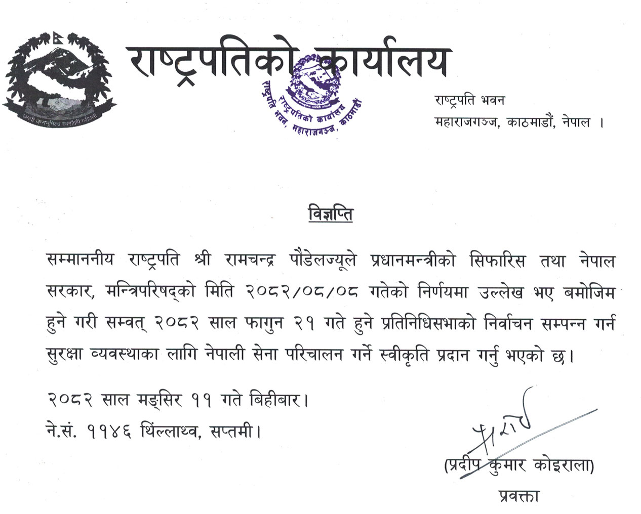 काठमाडौँ। राष्ट्रपति रामचन्द्र पौडेलले आगामी २१ फागुनमा हुने भनिएको प्रतिनिधिसभा निर्वाचनमा सेना परिचालन गर्नका लागि अनुमति दिएका छन्।