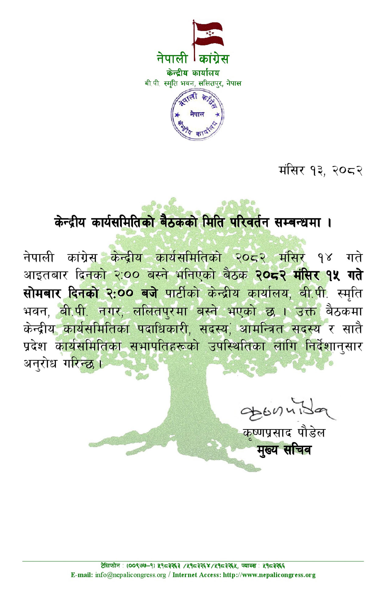 यसअघि १४ मंसिरका लागि बोलाइएको बैठक विशेष कारणले गर्दा १५ मंसिरसम्मका लागि सारिएको कांग्रेस केन्द्रीय कार्यालयका मुख्यसचिव कृष्णप्रसाद पौडेलले जानकारी दिए। बैठक सोमबार दिउँसो २ बजे पार्टी केन्द्रीय कार्यालय सानेपामा बस्नेछ।
