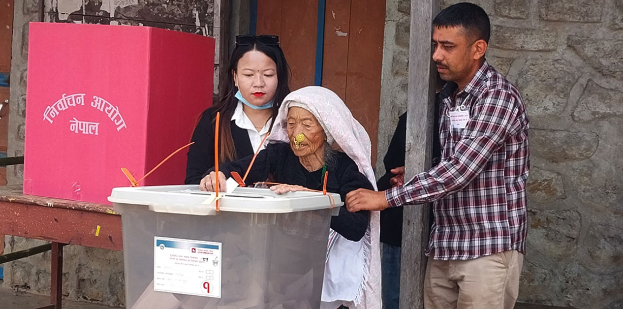 प्रतिनिधिसभा निर्वाचन क्षेत्र नम्बर २ मा भएको उपनिर्वाचनमा मतदान गरिरहेकी वृद्धा। तस्बिर : रासस