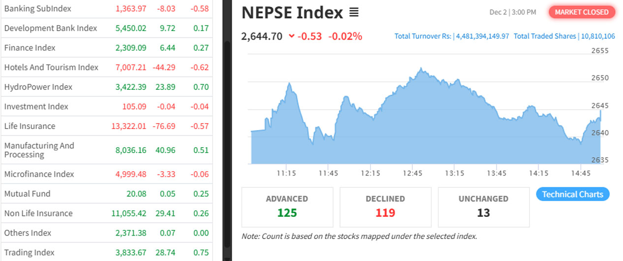 काठमाडौँ। अघिल्लो साताभर बढेको सेयर बजार यो साता भने ओरालो लागिरहेको छ। साताको पहिलो कारोबार दिन आइतबार २६.५१ अंकले घटेको नेप्से हिजो (सोमबार) पनि ४.२८ अंकले घट्यो। आज मंगलबार पनि नेप्से ०.५३ अंकले घट्यो। मंगलबार ०.०२ प्रतिशतले घटेको नेप्से २६४४.७० विन्दुमा अडियो।