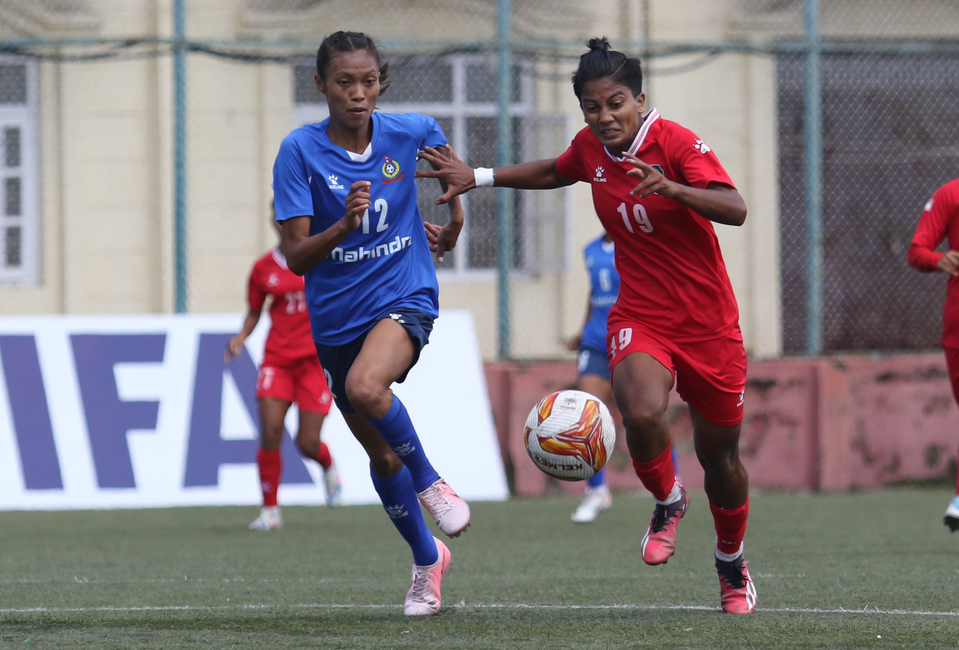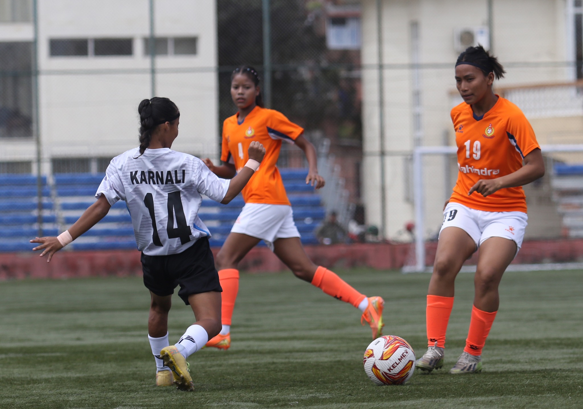 एन्फा महिला लिगमा त्रिभुवन आर्मी क्लबविरुद्धको खेलमा एफीएफ क्लबका खेलाडी। तस्बिर : एन्फा