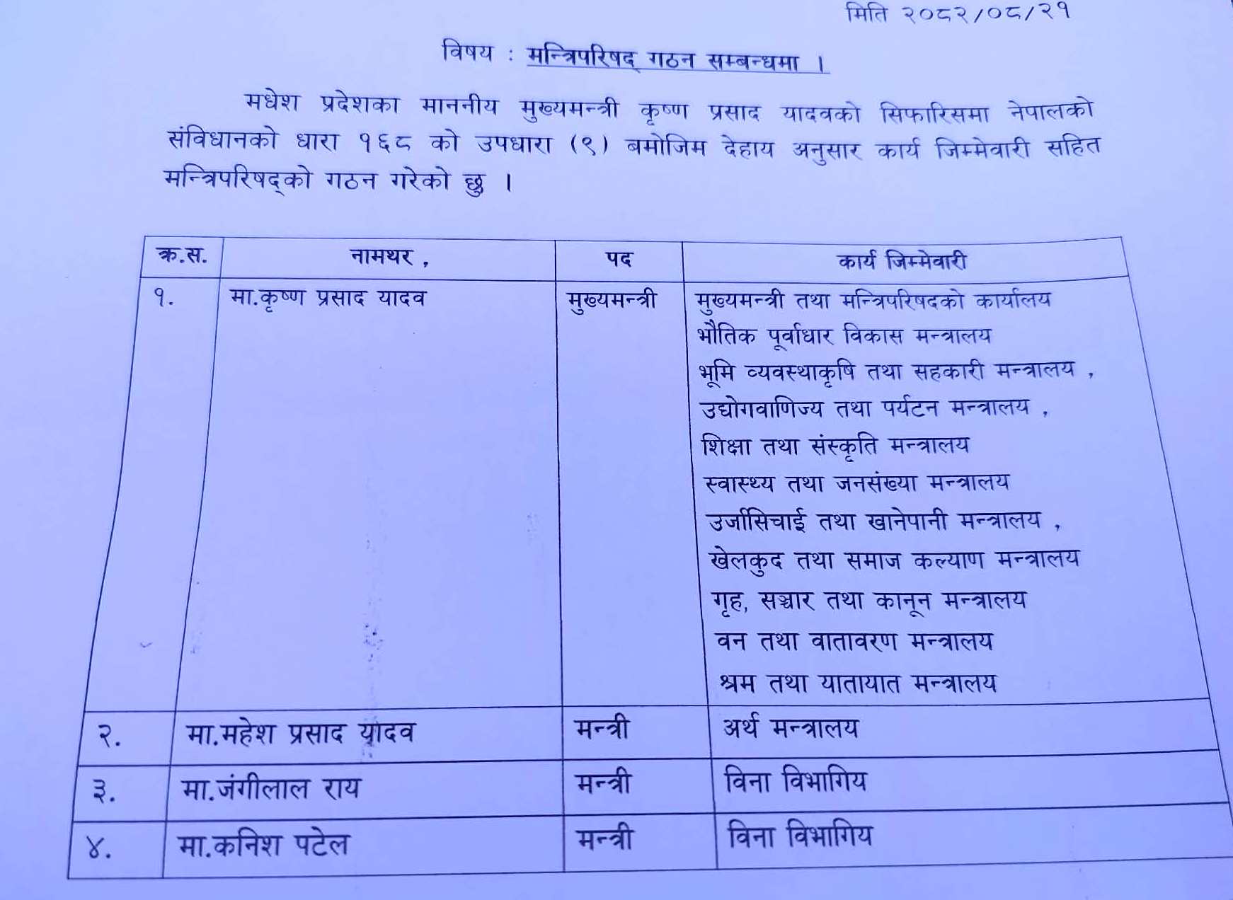 जनमत पार्टीबाट महेश यादव अर्थमन्त्री भएका छन् भने नेपाली कांग्रेसबाट जङ्गीलाल यादव र नेकपा एकीकृत समाजवादीबाट कनिस पटेल बिना विभागीय मन्त्री बनाइएका छन्।