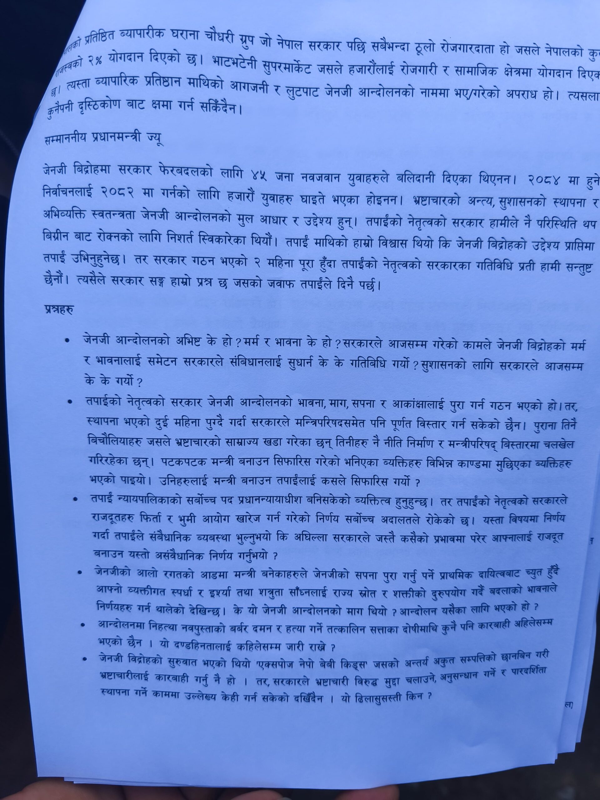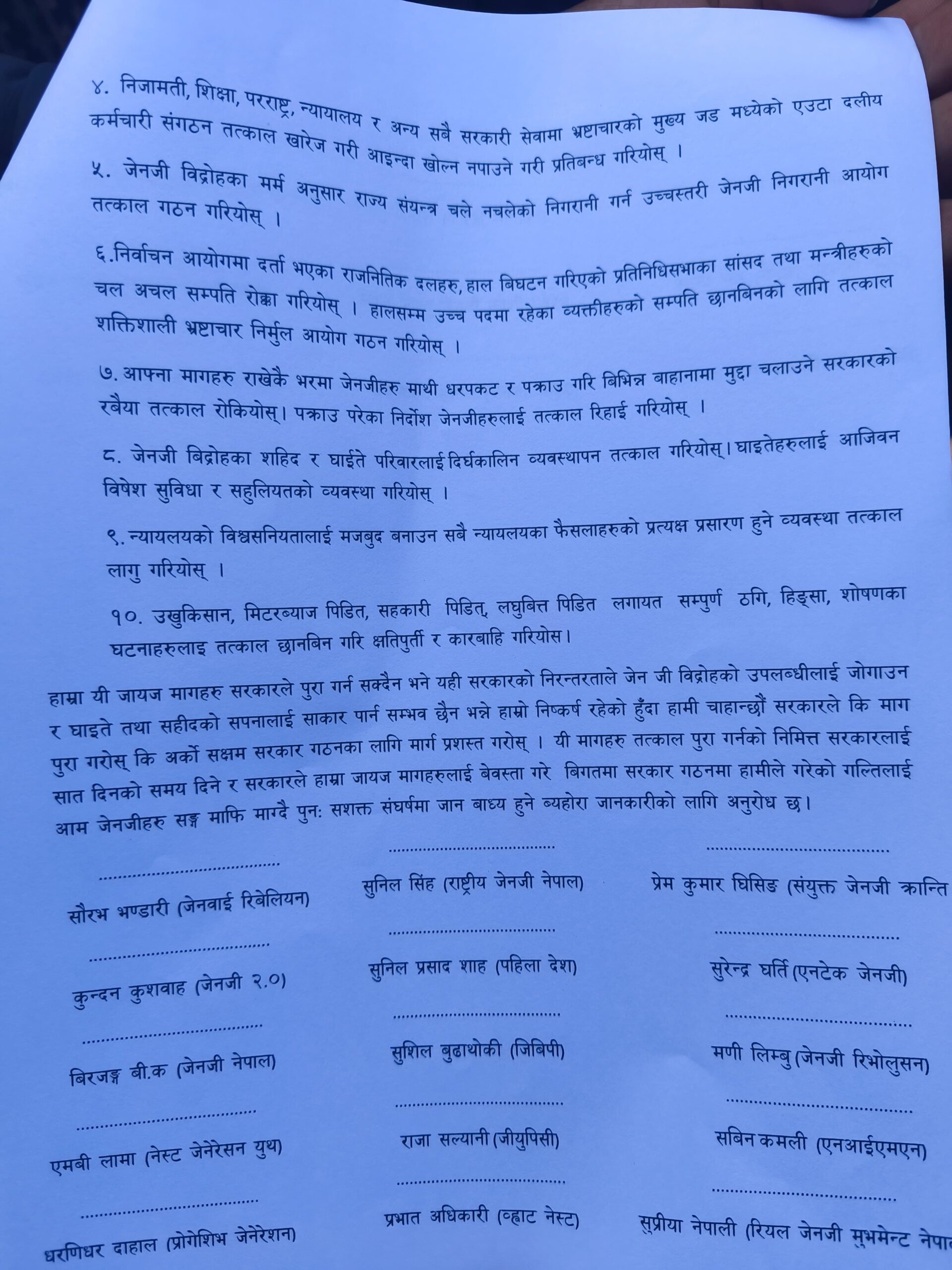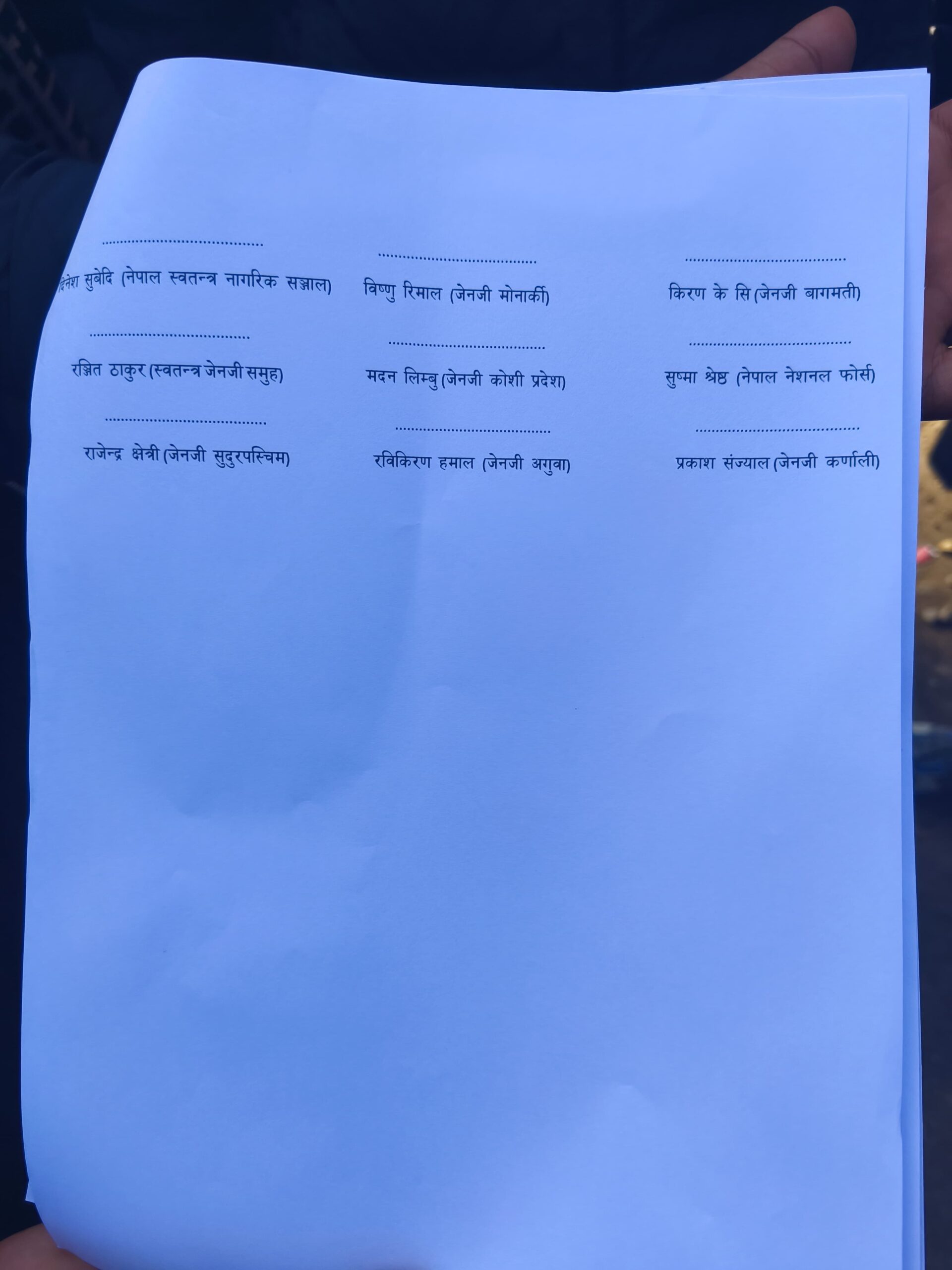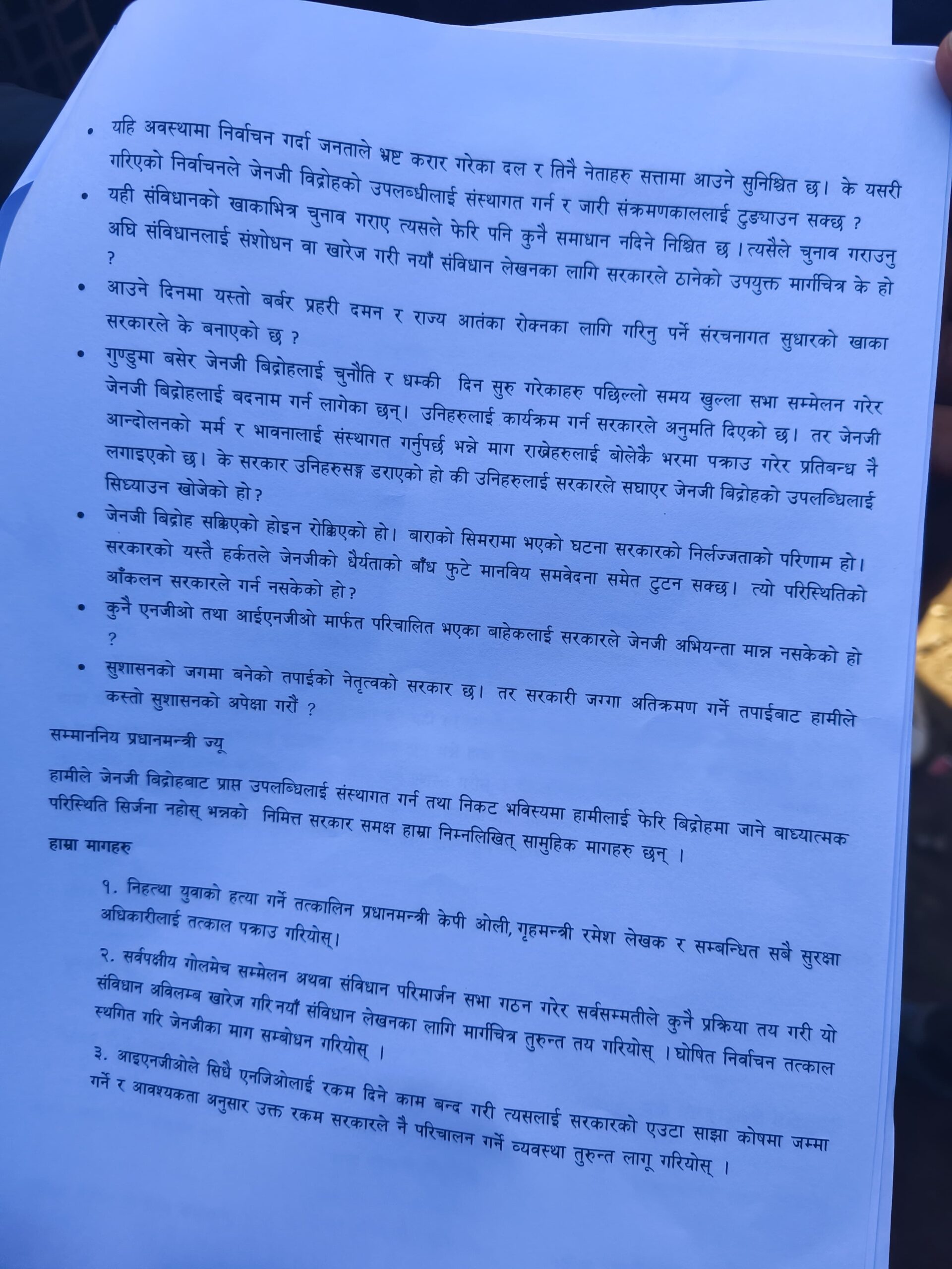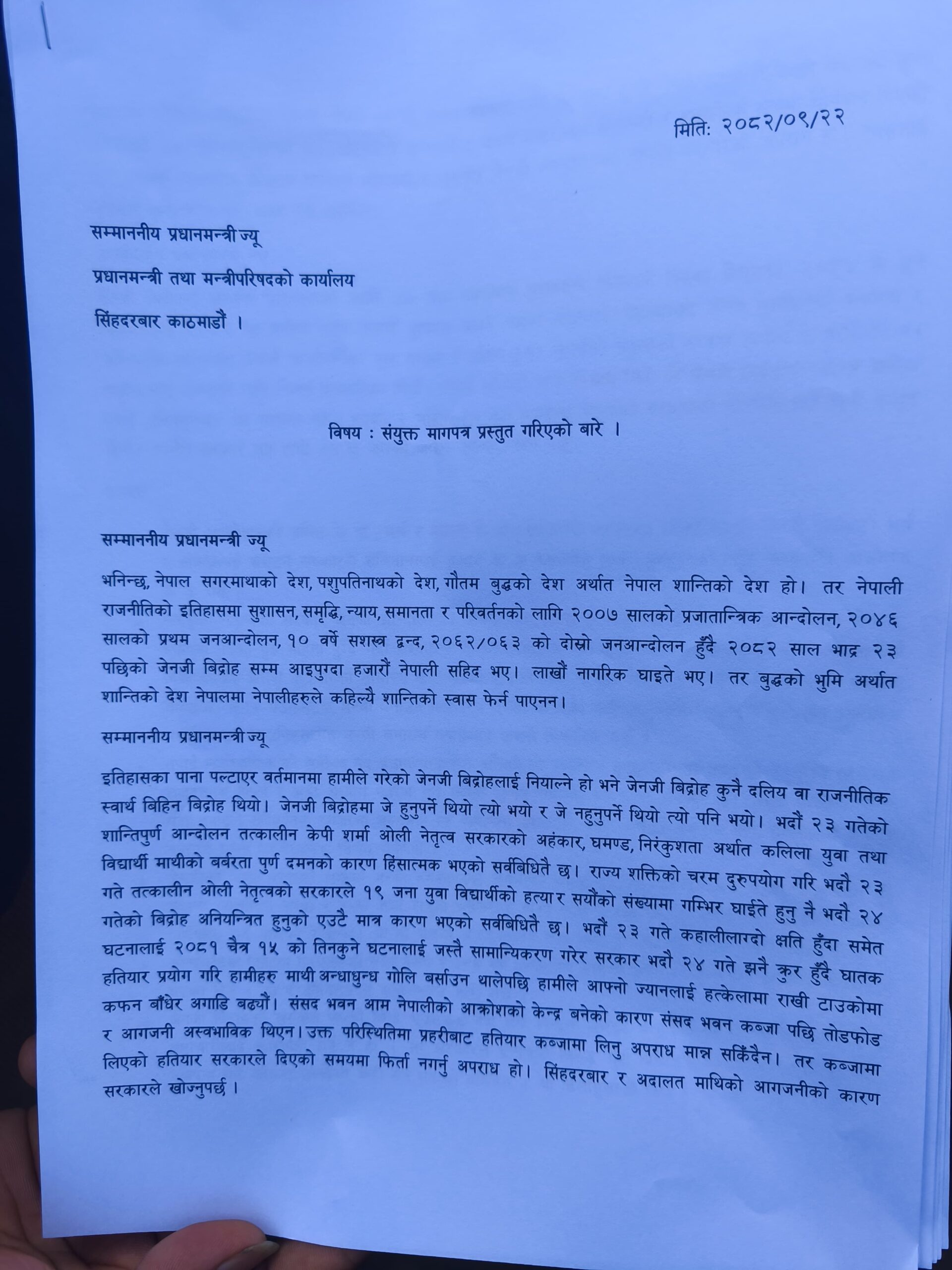 काठमाडौँ। जेन-जी संयुक्त समूहले आज डिल्लीबजारस्थित हुलाक कार्यालयमार्फत प्रधानमन्त्री सुशीला कर्कीलाई आफ्ना मागपत्र पठाएका छन्।