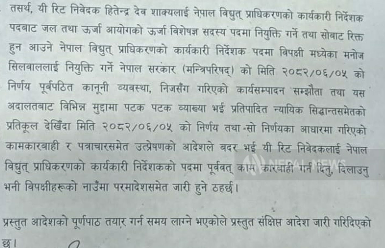 काठमाडौँ। सर्वोच्च अदालतले हितेन्द्रदेव शाक्यलाई नेपाल विद्युत् प्राधिकरणको कार्यकारी निर्देशक पदमा फर्केर काम गर्न परमादेश जारी गरेको छ। न्यायाधीशहरू नहकुल सुवेदी र श्रीकान्त पौडेलको संयुक्त इजलासले आज (सोमबार) यस्तो परमादेश दिएको हो।
