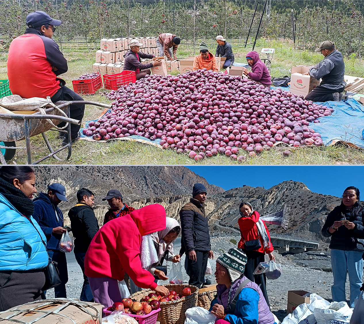 मुस्ताङको थासाङ गाउँपालिका-१ टुकुचे गाउँका किसान बारीमा लटरम्म फलेको स्याउ टिपेर बजार लैजाने तयारी गर्दै। तस्बिर : सुशीलबाबु थकाली/रासस