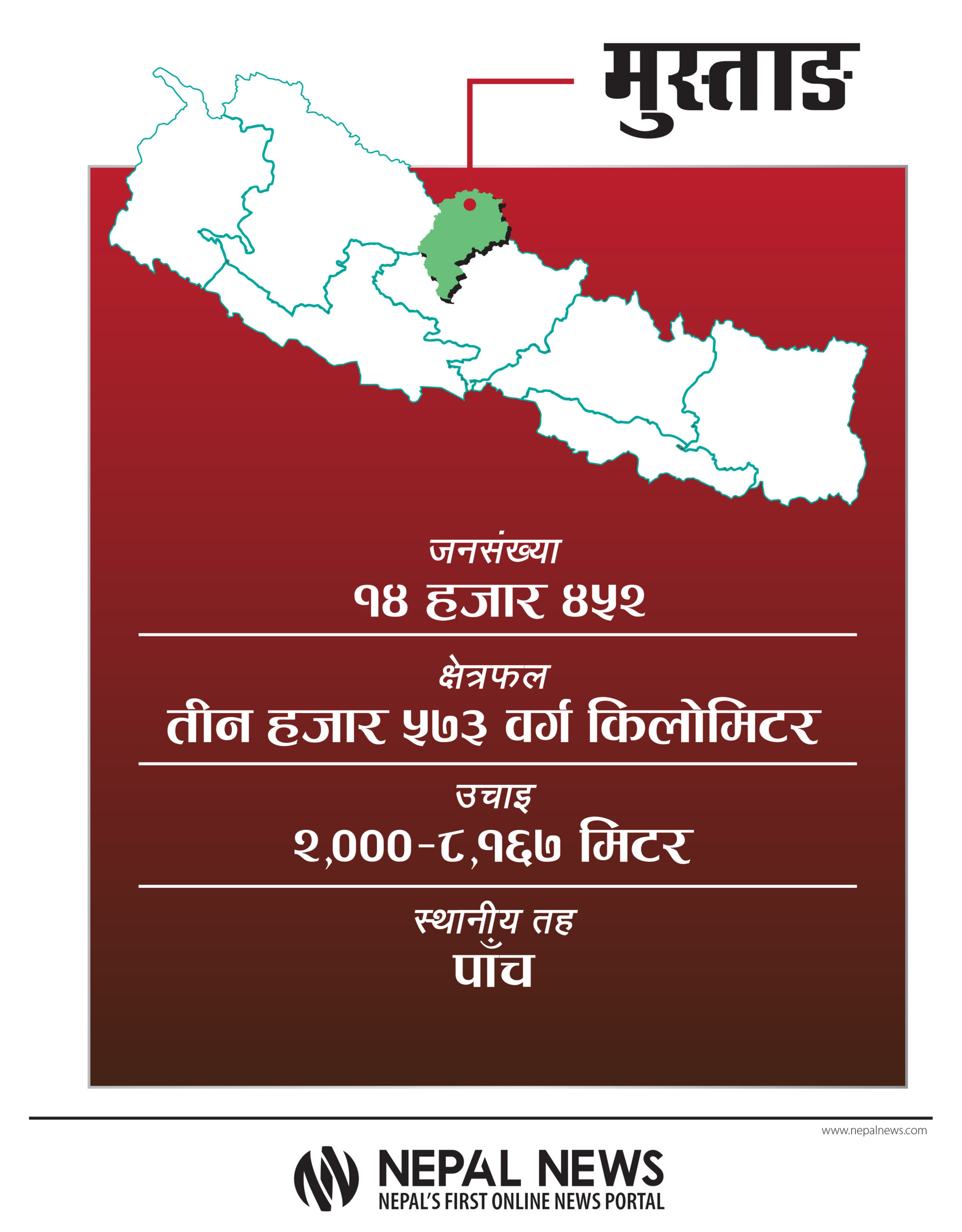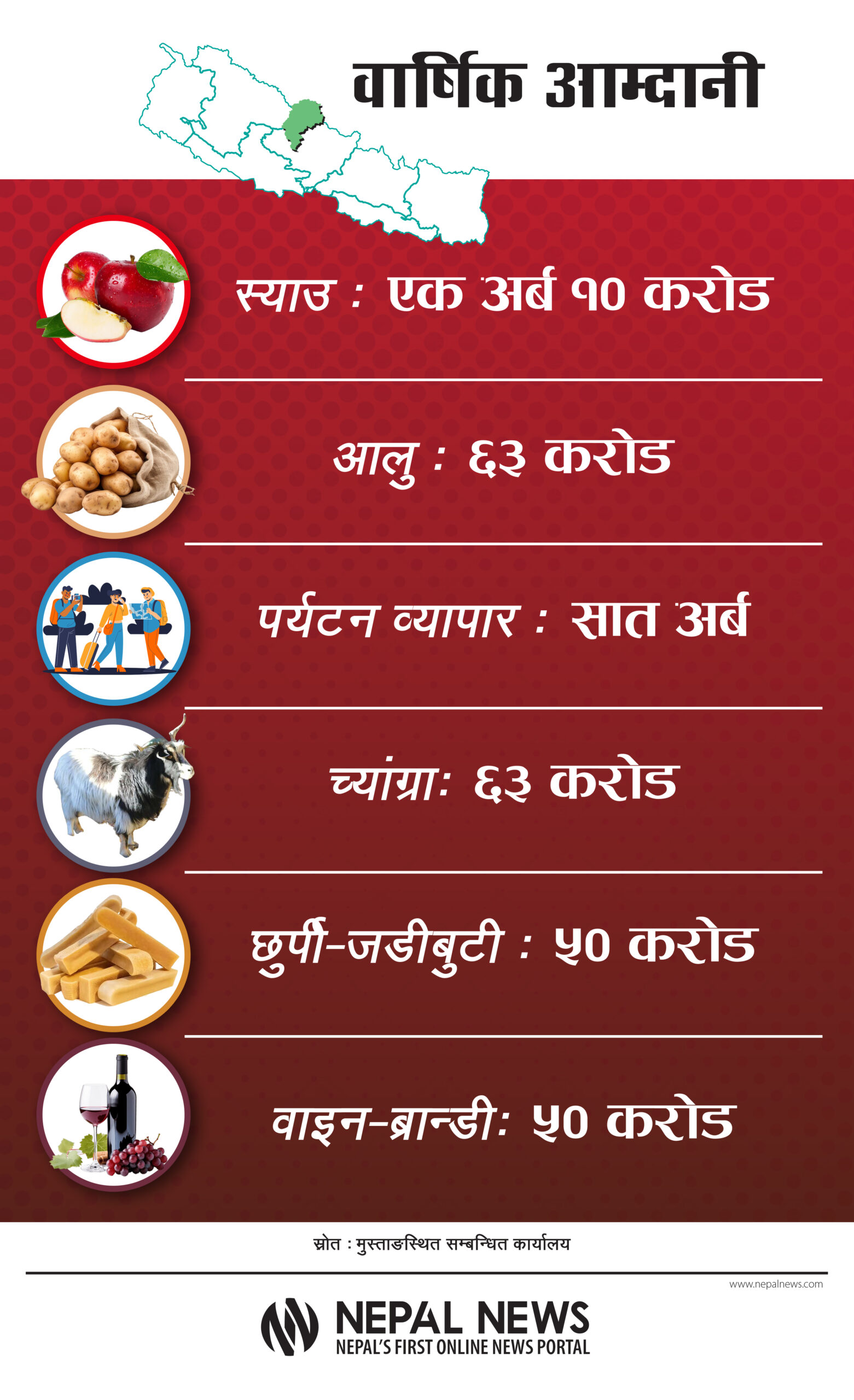 हुन पनि, हिमालपारिको जिल्ला भनेर चिनिने मुस्ताङ कुनै बेला विकट र विकासमा पछौटे मानिन्थ्यो। तर, विकासका पूर्वाधार पुगेसँगै अहिले मुस्ताङ कृषि र पर्यटनका माध्यमबाट समृद्ध बनिरहेको छ। सानो भूगोल, थोरै जनसंख्या, भौगोलिक विकटता र दक्ष जनशक्तिको अभावबीच मुस्ताङले कृषि, पशुपालन र पर्यटनबाट वार्षिक कम्तीमा १० अर्बभन्दा बढी रुपैयाँ आम्दानी गरिरहेको छ। मुस्ताङ सडक सञ्जालमा जोडिएसँगै स्याउ, आलु, ओखरजस्ता रैथाने उत्पादनले सहजै बजार पाएका छन्। च्यांग्रा, याकलगायत पशु बिक्री सहज भएको छ।