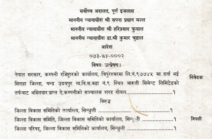 तत्कालीन जिविस सिन्धुलीले २२ वैशाख २०६६ मा चुनढुंगाको कर बुझाउन मारुती सिमेन्ट उद्योगको नाममा सूचना जारी गरेको थियो। सिरहास्थित मारुती सिमेन्ट लिमिटेडका तर्फबाट सञ्चालक शरद गोयलले २५ असार २०७२ मा सर्वोच्च अदालतमा रिट निवेदन दर्ता गरेका थिए। रिटमा सिमेन्ट उत्पादनका लागि चाहिने चुनढुंगामा दोहोरो कर लगाइएको भन्दै तत्कालीन जिविस सिन्धुलीलगायतलाई विपक्षी बनाइएको थियो। ‘दोहोरो पर्नेगरी स्थानीय विकास शुल्क र निकासी कर छुट्टाछुट्टै लागू गर्नु कर असुलीको सिद्धान्त र उद्देश्य विपरीत रहेकाले निर्णय, सूचना, चिठीपत्रले संवैधानिक, कानुनी अधिकार हनन भएको’ दाबी रिट निवेदकको थियो।