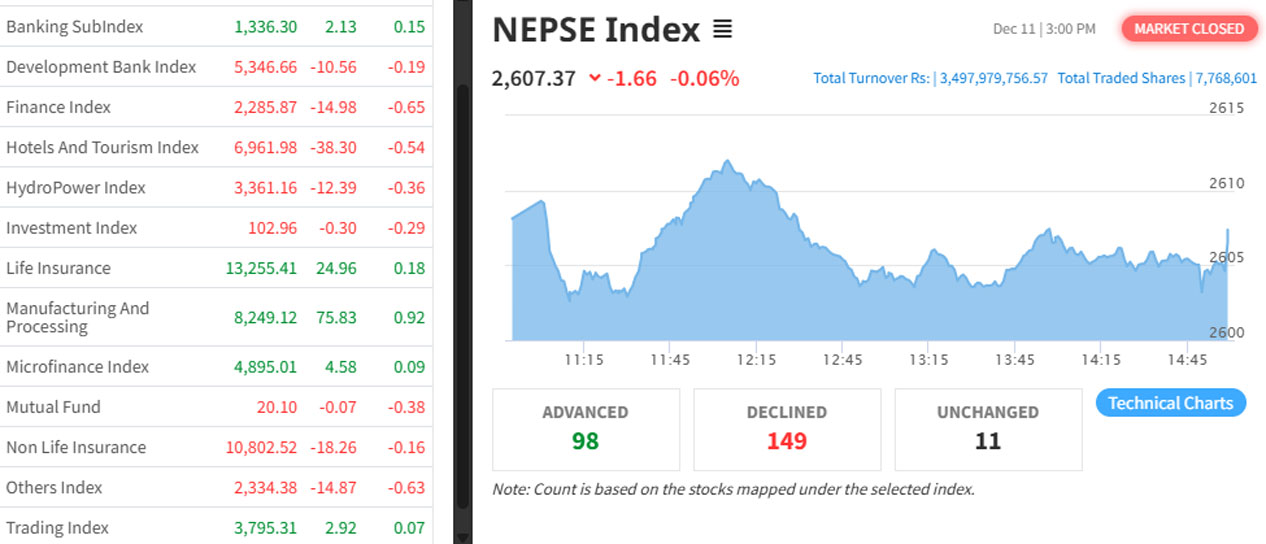 नेप्सेले घट्ने सिलसिला कायमै राख्दै आज (बिहीबार) पनि एकल अंकले ओरालो लाग्यो। आज नेप्से १.६६ अंकले घटेर २६०७.३७ विन्दुमा रोकियो। नेप्से आज ०.०६ प्रतिशतले घटेको हो।
