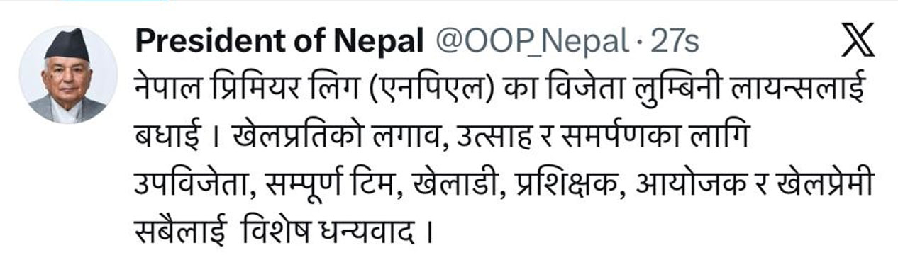 काठमाडौँ। राष्ट्रपति रामचन्द्र पौडेलले नेपाल प्रिमियर लिग (एनपीएल) को उपाधि विजेता लुम्बिनी लायन्सलाई बधाई दिएका छन्।