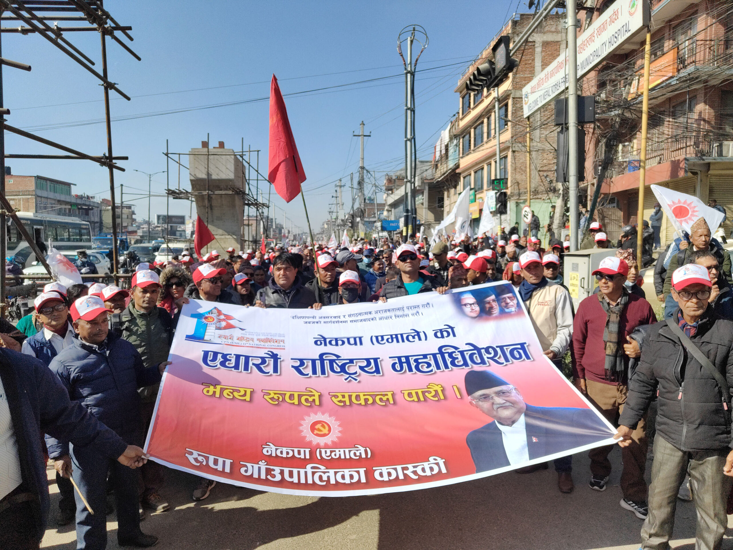 पञ्चैबाजा नौसिङ्गे बाजागाजासहित विभिन्न वेशभूषासहित भक्तपुरका विभिन्न ठाउँ निस्केका थिए। भक्तपुरको सल्लाघारीमा आयोजित महाधिवेशनको उद्घाटन पार्टी अध्यक्ष केपी ओलीले गरेका छन्। महाधिवेशन २९ मंसिरसम्म सञ्चालन हुनेछ।
