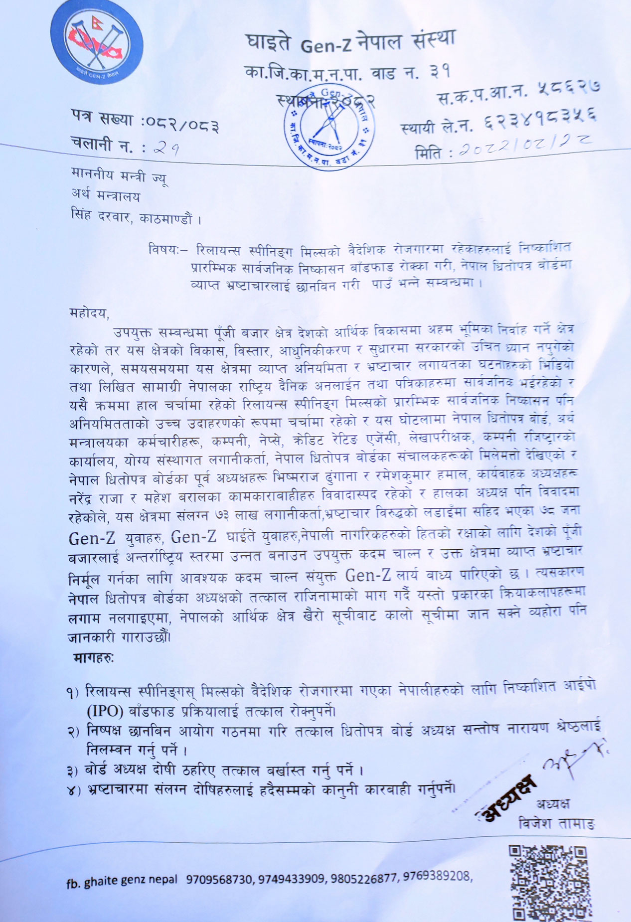 १) रिलायन्स स्पिनिङ्स मिल्सको वैदेशिक रोजगारमा गएका नेपालीहरुका लागि निष्काशित आईपी बाँडफाँड प्रक्रियालाई तत्काल रोक्नुपर्ने।