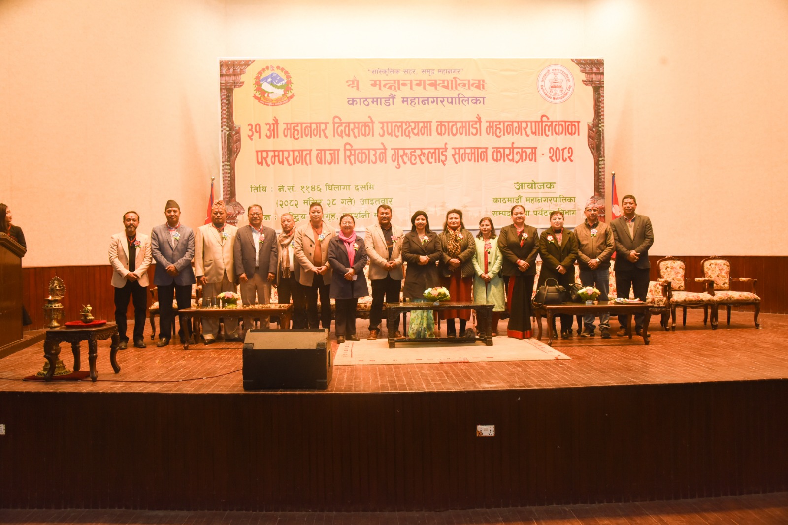 काठमाडौँ। काठमाडौँ महानगरपालिकाले २३५ जना परम्परागत बाजा गुरुलाई जनही ३० हजार रुपैयाँसहित सम्मान गरेको छ।