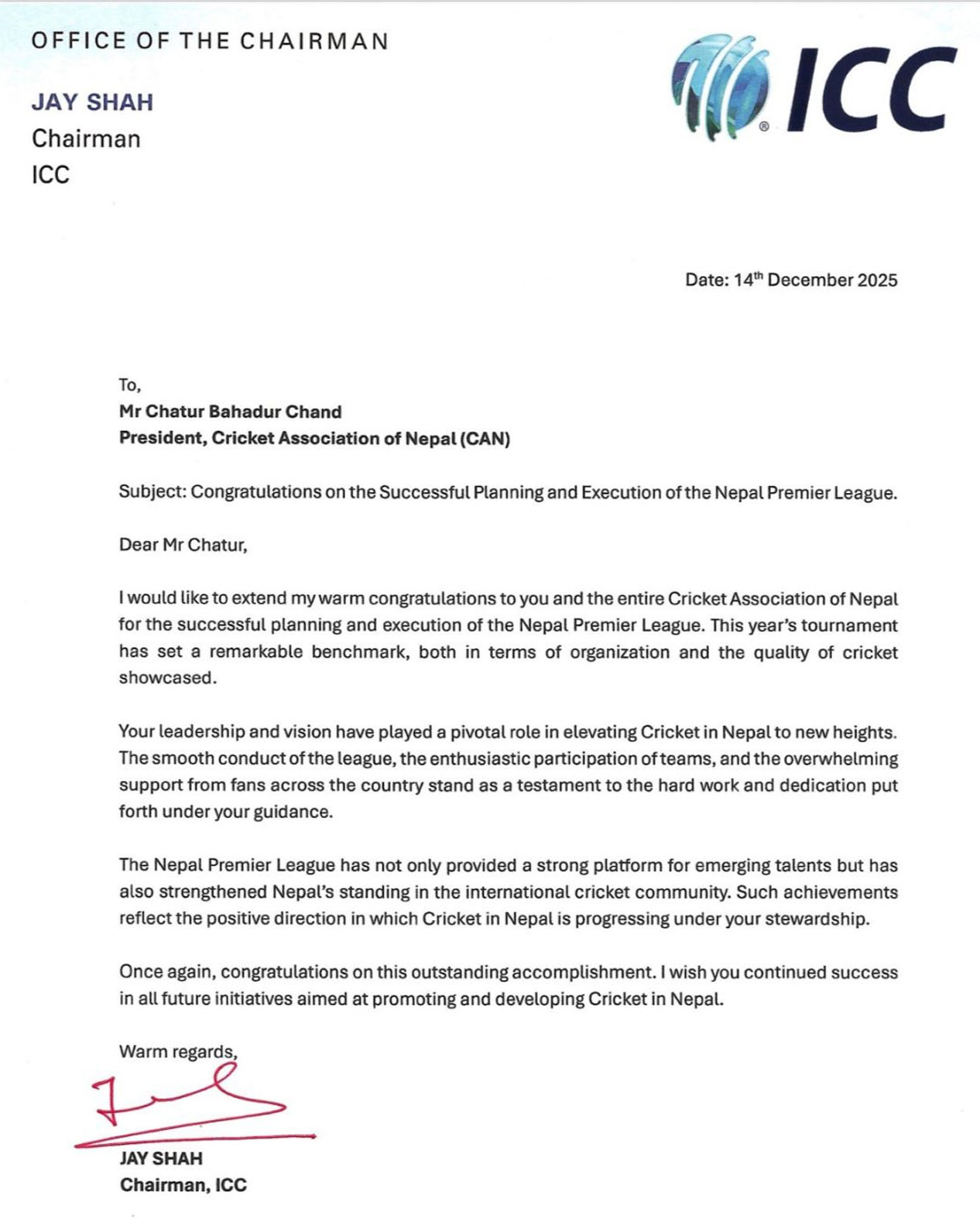 काठमाडौँ। अन्तर्राष्ट्रिय क्रिकेट परिषद् (आईसीसी) का अध्यक्ष जय शाहले नेपाल क्रिकेट संघ (क्यान) लाई नेपाल प्रिमियर लिग (एनपीएल) सफलतापूर्वक सम्पन्न गरेकामा बधाई दिएका छन्।