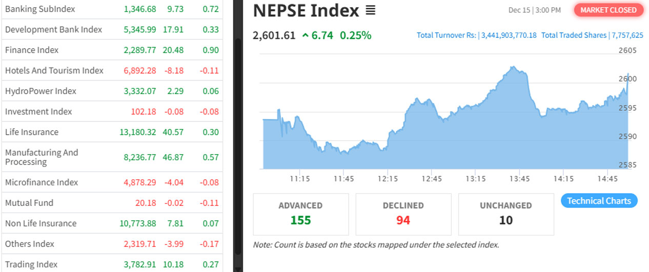 आइतबार १२.५० अंकले घटेको नेप्से सोमबार भने ६.७४ बढ्दै २६०१.६१ विन्दुमा रोकिएको छ। नेप्से ०.२५ प्रतिशतले बढेको हो।