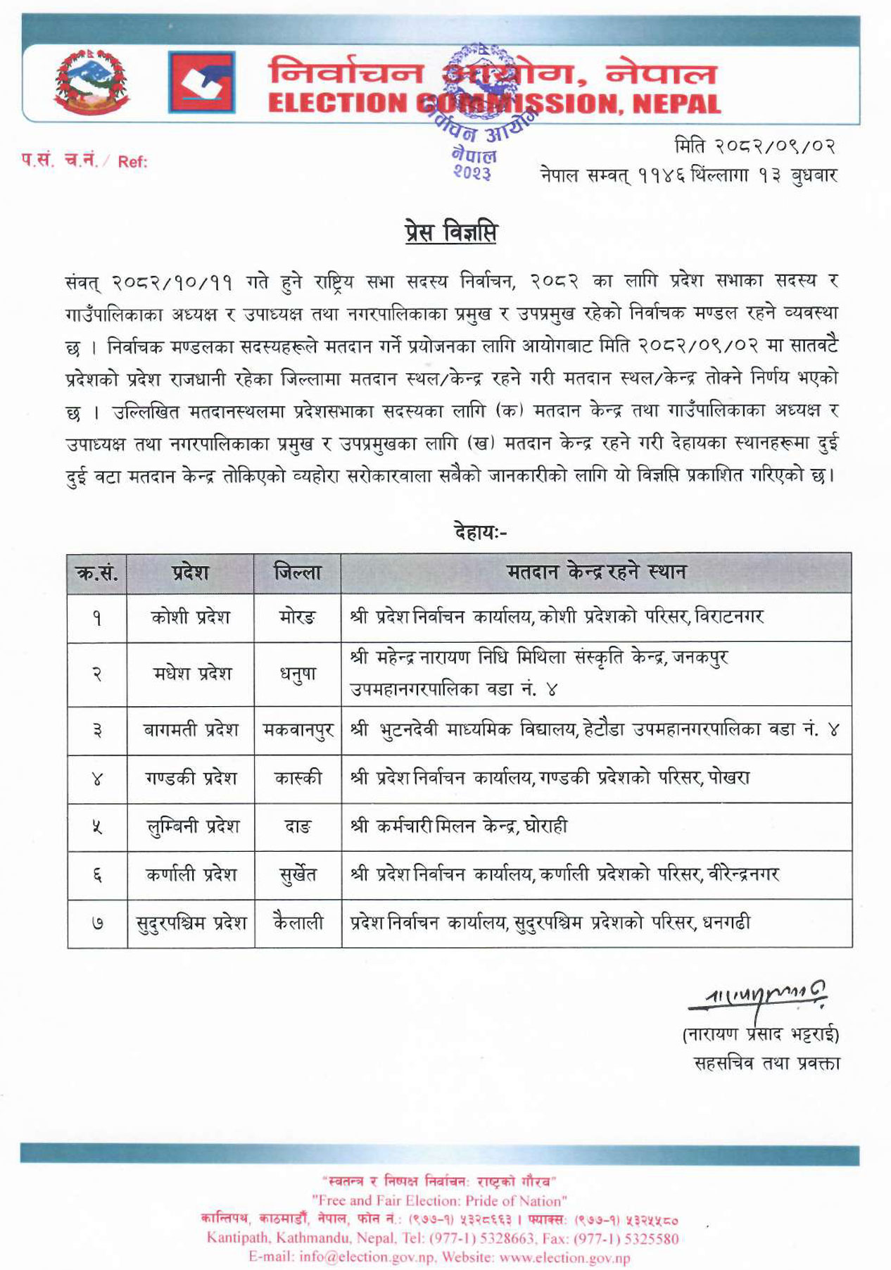 उनले भने‚ “आयोगले सातवटै प्रदेशको राजधानी रहेका जिल्लामा मतदानस्थल रहने गरी स्थान तोकिसकेको छ‚ तोकिएका मतदानस्थलमा दुई-दुईवटा मतदान केन्द्र रहने व्यवस्था मिलाइएको छ।” जसमा निर्वाचनमा प्रदेशसभाका सदस्य, गाउँपालिकाका अध्यक्ष र उपाध्यक्ष तथा नगरपालिकाका प्रमुख र उपप्रमुख रहेको निर्वाचन मण्डलले मतदान गर्ने व्यवस्था छ भने मतदान केन्द्र ‘क’ प्रदेशसभाका सदस्यका लागि र मतदान केन्द्र ‘ख’ गाउँपालिकाका अध्यक्ष र उपाध्यक्ष तथा नगरपालिकाका प्रमुख र उपप्रमुखका लागि तोकिएको छ।